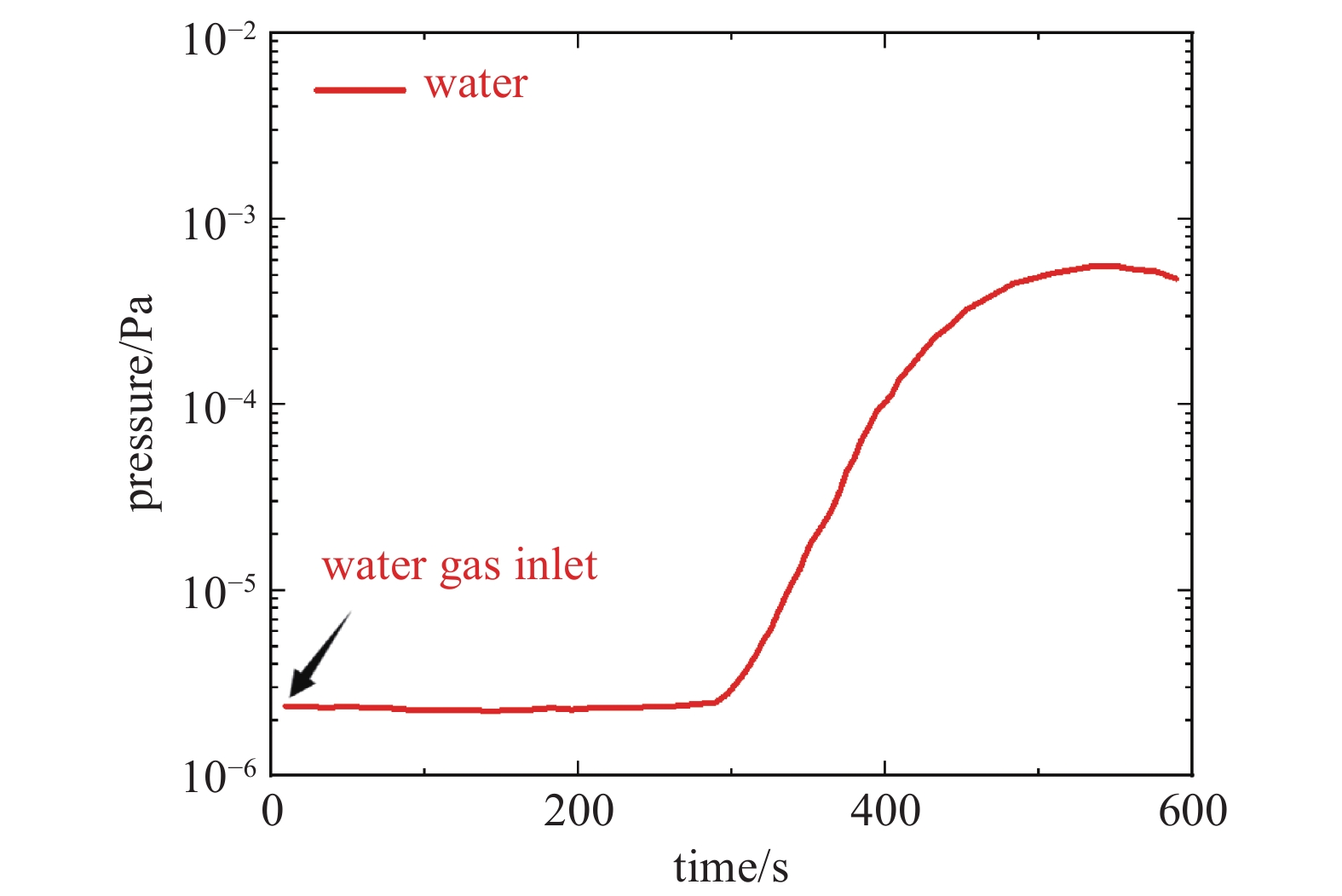 氮气实验做完后,关闭与进气装置间的阀门,让狭缝腔体内的压力回到本底状态后,将制备好的水蒸气连接到腔体上,使前级稳压室压力控制在 500 Pa,打开阀门通入水蒸气。在打开稳压室与腔体间的阀门后,稳压室由于氮气等气体的迅速逸出,压力由 500 Pa 迅速降为 496 Pa,然后降低速度极缓慢。远端真空计的示数从 5×10−4 Pa 迅速升为 3 Pa 并持续上升,在实验结束时上升至 20 Pa。
