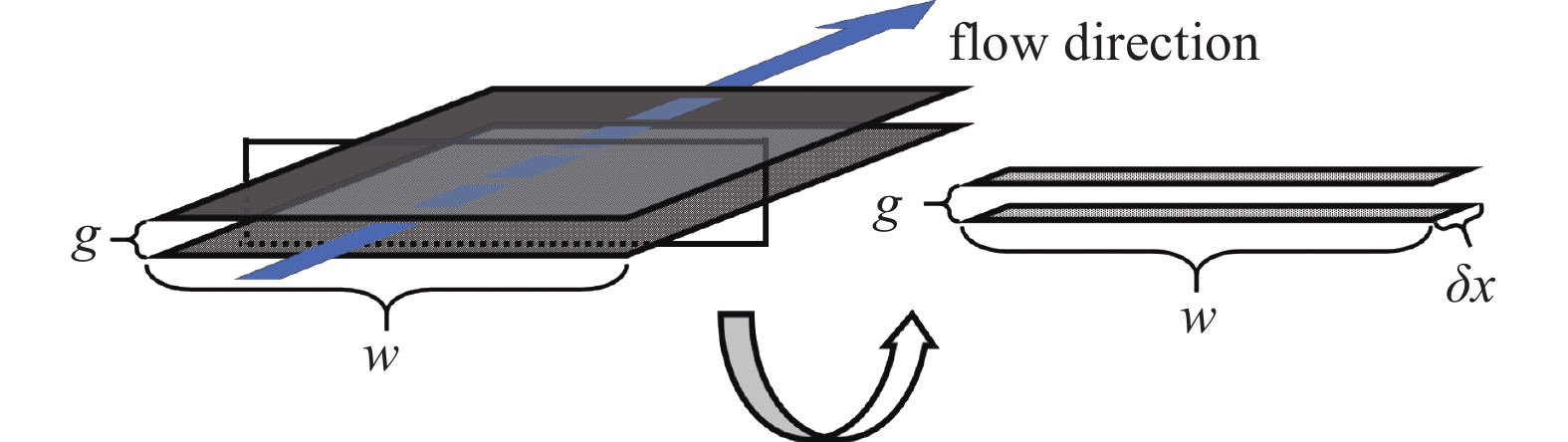如图8,取长w,高g,深δx的微元体积,其中w为狭缝的宽度,g为狭缝的高。由质量守恒定律可知: