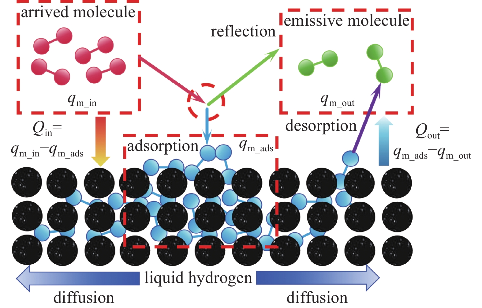 目前,尽管已有部分研究提出了针对制冷机低温泵(以下简称低温泵)抽气行为的预测方法,例如Varoutis S等[4]结合测试粒子蒙特卡洛法和直接蒙特卡洛方法(DSMC)对ITER低温泵装置进行建模,进而获得压力分布及各个冷板吸附粒子数;Mukherjee S S等[5]通过Ansys软件的稳态热模块模拟贮槽式低温泵的温度分布,解析了低温泵在不同结构下的温度变化;Gangradey R等[6]先利用Monte Carlo模拟工具Molflow+分析低温泵内部气体流动模式,再根据气体流动研究结果与有限元软件结合进行的热分析,最终根据模拟计算结果设计用于托卡马克装置的低温泵结构。但这些研究主要集中在低温泵的整体性能预测和结构设计上。对于低温泵冷板表面温度与气体吸附行为之间的动态关系,尤其是低沸点气体在微小温度扰动下的黏附系数变化[7]及其对吸附过程的影响,尚未有系统的数值模型进行描述。此外,吸附过程中释放的潜热与吸附质量之间的耦合关系,以及其对温度场分布的反馈作用,也缺乏深入的研究。