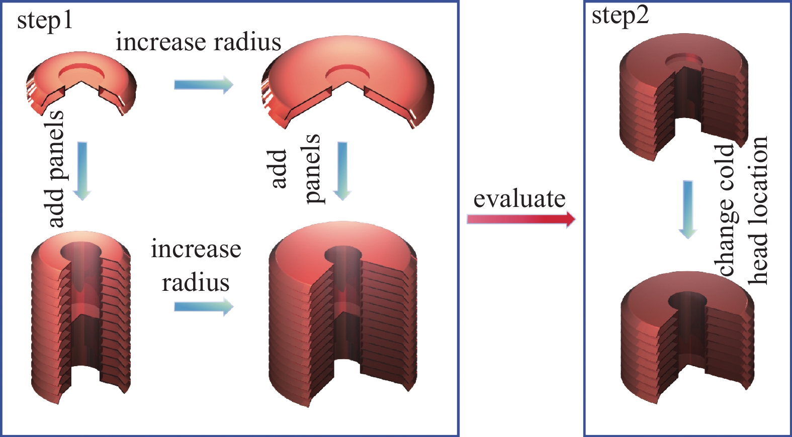 • 参考JB/T 11081—2011[13]制冷机低温泵设计标准提供的基本参数,低温泵公称通径选定为250 mm。为研究低温泵冷板阵列结构对抽气行为的影响,本文首先调整冷板阵列的半径(60 mm至105 mm,步长5 mm)与冷板层数(2层至15层,步长1层),根据降温时间、工作寿命、抽速三个指标评估合理的冷板阵列结构,再基于该结构调整二级冷头位置,获得最终制冷机低温泵结构。具体冷板结构及分析流程如图2所示。