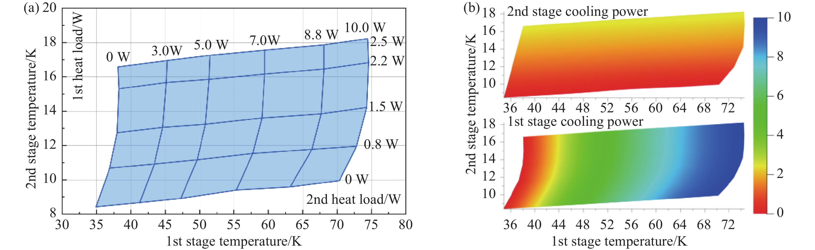 • 根据经验,对于公称通径为250 mm制冷机,一级冷头的冷量应大于8 W(77 K),二级冷头冷量应大于2.2 W(20 K),据此参考某厂商生产的G-M制冷机[15],其制冷量网状图如图3(a)所示。为将制冷量参数与传热求解器耦合,采用最小二乘法拟合冷头温度与冷量,如图3(b)所示。