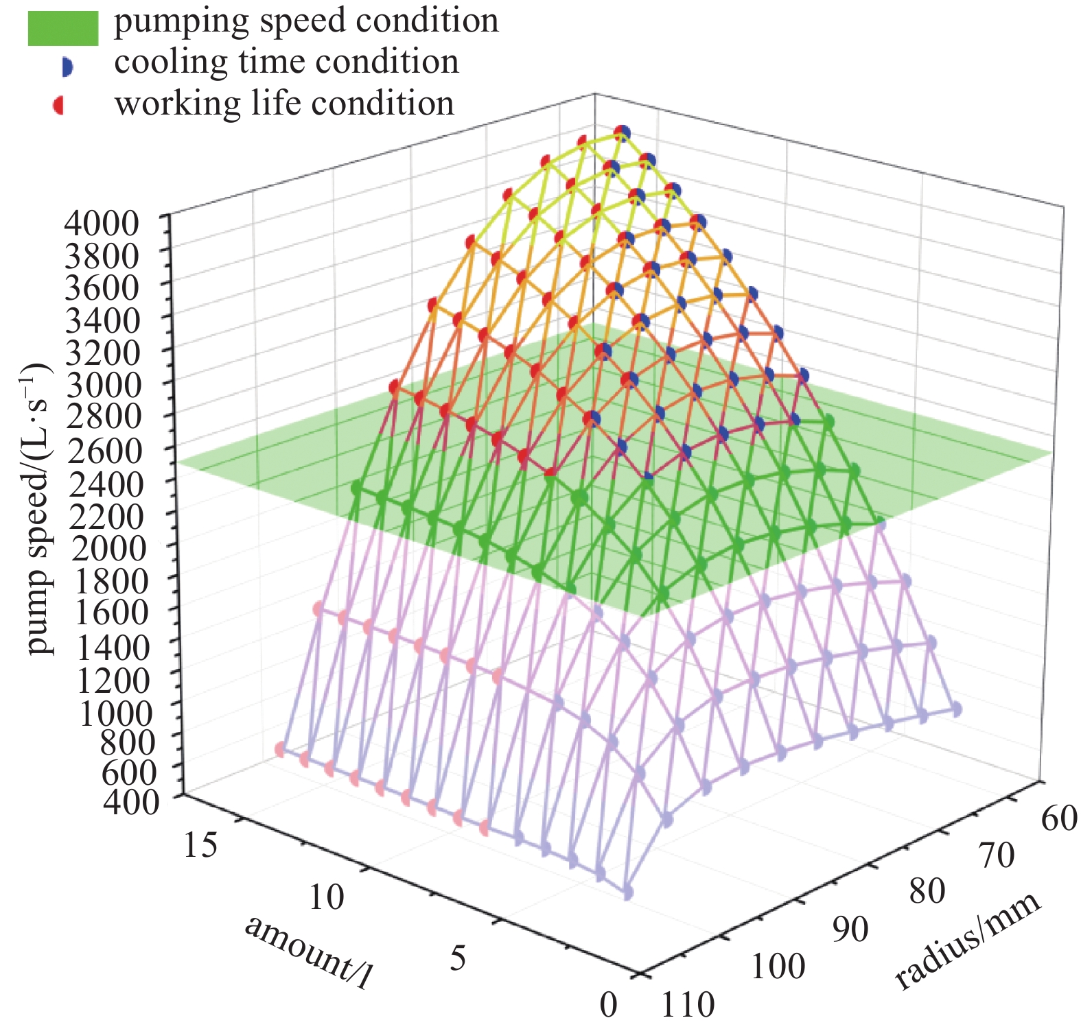 本泵抽速(L/s)为测试气体流量与泵入口处压力比值,参考市面上相同口径低温泵,泵抽速应当大于2500 L/s,工作寿命(测试气体流量为168.9 Pa∙L/s,即100 sccm)应长于200 min。JB/T 11081—2011[13]中推荐250 mm口径低温泵降温时间应小于100 min。图4中绿色截面代表了抽速条件(大于2500 L/s),红色左半圆代表了工作寿命条件(大于200 min),蓝色右半圆代表了降温时间条件(小于100 min)。通过上述三种条件筛选,同时考虑到生产成本,应当尽量减少制造材料,最终选择包含9层冷板,半径为90 mm的冷板阵列作为进一步研究对象。