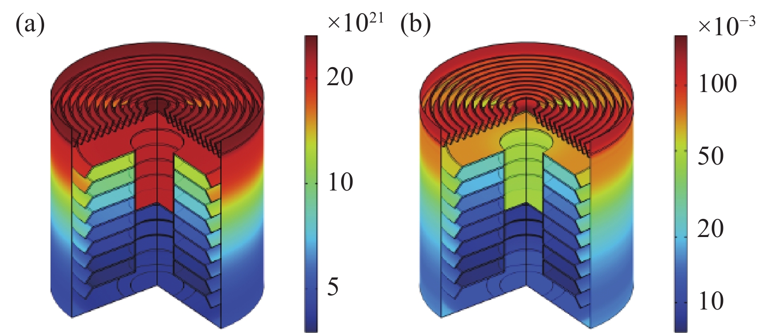 • 为了深入理解低温泵内部气体分子及热量分布规律,对低温泵内部入射分子通量及压力分布进行分析,图5分别为低温泵入射分子通量及压力分布,以上两种变量均自上而下逐渐降低,在低温泵底部显示出最低的入射分子通量及压力。虽然分子通量相近,但考虑到温度对压力的影响,根据查理定律,经过挡板的冷却后,在第一层冷板的压力(0.07 Pa)明显低于挡板处的压力(0.13 Pa)。