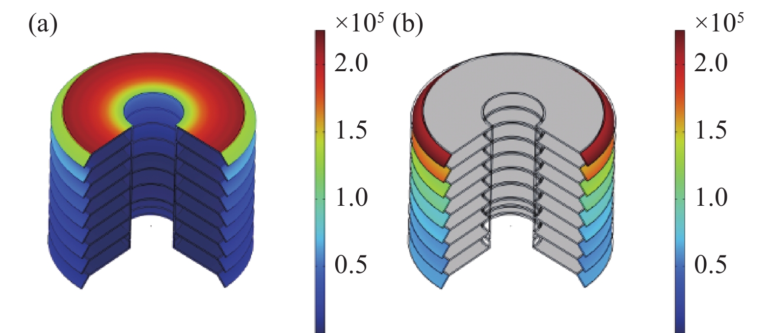 • 本文通过参数化扫描方法,分别调整了冷板阵列的半径尺寸和层数,不同参数冷板阵列对应的抽速变化如图4所示,随着冷板层数增多,低温泵的抽速也逐渐提高,但当层数增加至10层后,继续增加冷板对抽速提升效果较少,同时这一提升也受到冷板半径影响。而随着冷板半径增大,抽速出现先提高后降低的趋势,在冷板半径为85−95 mm时达到最大抽速。这种现象是因为,当提升冷板半径时,冷板与冷屏的间隙减小,因此降低了低温泵内部流导,因此气体难以向底部扩散,影响了低温泵的抽气能力。