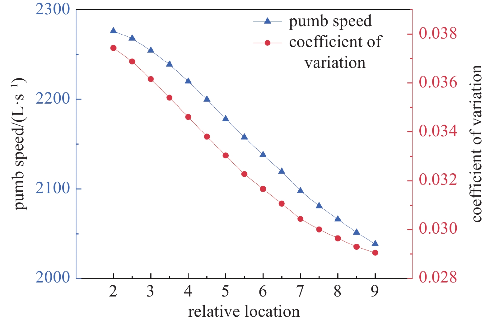 图7展示了进气量设置为337.8 Pa∙L/s(200 sccm),低温泵工作120 min后,不同冷头位置对应的抽速及吸附量离散系数,其中二级冷头的相对位置由顶层2等间距调整至底层9。由图7可知,随着二级冷头位置由顶层向底层调整,离散系数逐渐降低,即每层冷板吸附量逐渐趋于均衡,但抽速性能也在降低。当二级冷头相对位置为2时,低温泵具有最高抽速;而当相对位置为9时,冷板阵列吸附量的离散系数最小,再生间隔最长。对于气体负载较大的真空系统,应当将二级冷头设置在冷板阵列的上端;而对于气体负载较小,要求维持真空度的真空系统,则应当将二级冷头设置在下端。