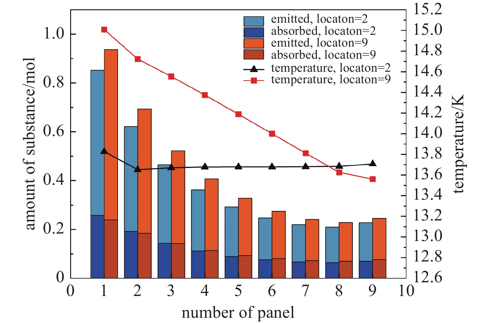 进一步探究二级冷头位置对冷板阵列吸附能力的影响,分别分析二级冷头相对位置为2和9时,每层冷板的吸收、反射物质的量和温度。如图8所示,相对位置9的气体分子反射量始终略高于相对位置2,尤其对于顶层冷板,这使得气体分子有更大概率向冷板阵列下端扩散,从而提高下端冷板的入射量;对于前三层冷板,相对位置9的吸附量小于相对位置2,而从第四层冷板开始,相对位置2的吸附量小于相对位置9。当二级冷头相对位置为2时,冷板之间温差极小,最大温差小于0.2 K,同时由于二级冷头处于高温区,提供的冷量也更高,因此阵列平均温度相对更低。由于顶端冷板的入射量更大,其吸收量也高于其他位置的冷板。而当二级冷头相对位置为9时,冷板之间产生温度梯度,通过降低下端冷板温度,提高黏附系数,从而向下端冷板的吸收量提供一定补偿,因此降低了冷板阵列吸收量的离散系数。