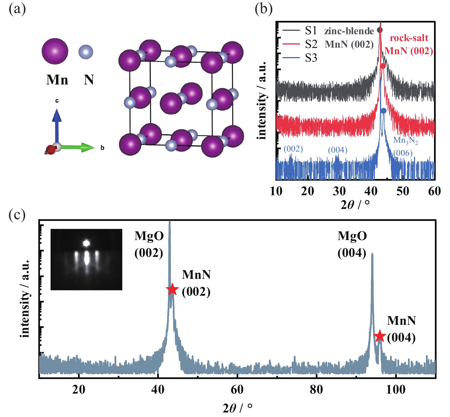 图 1 氮化锰晶格结构的示意图以及最佳生长条件的确认。(a)MnN元胞的示意图,其中紫色和灰色小球分别表示锰原子和氮原子,(b)表一中不同生长条件下样品的XRD谱图,(c)最佳生长条件下所制备MnN的宽范围 θ–2θ XRD谱图。插图是薄膜生长后的RHEED衍射图案