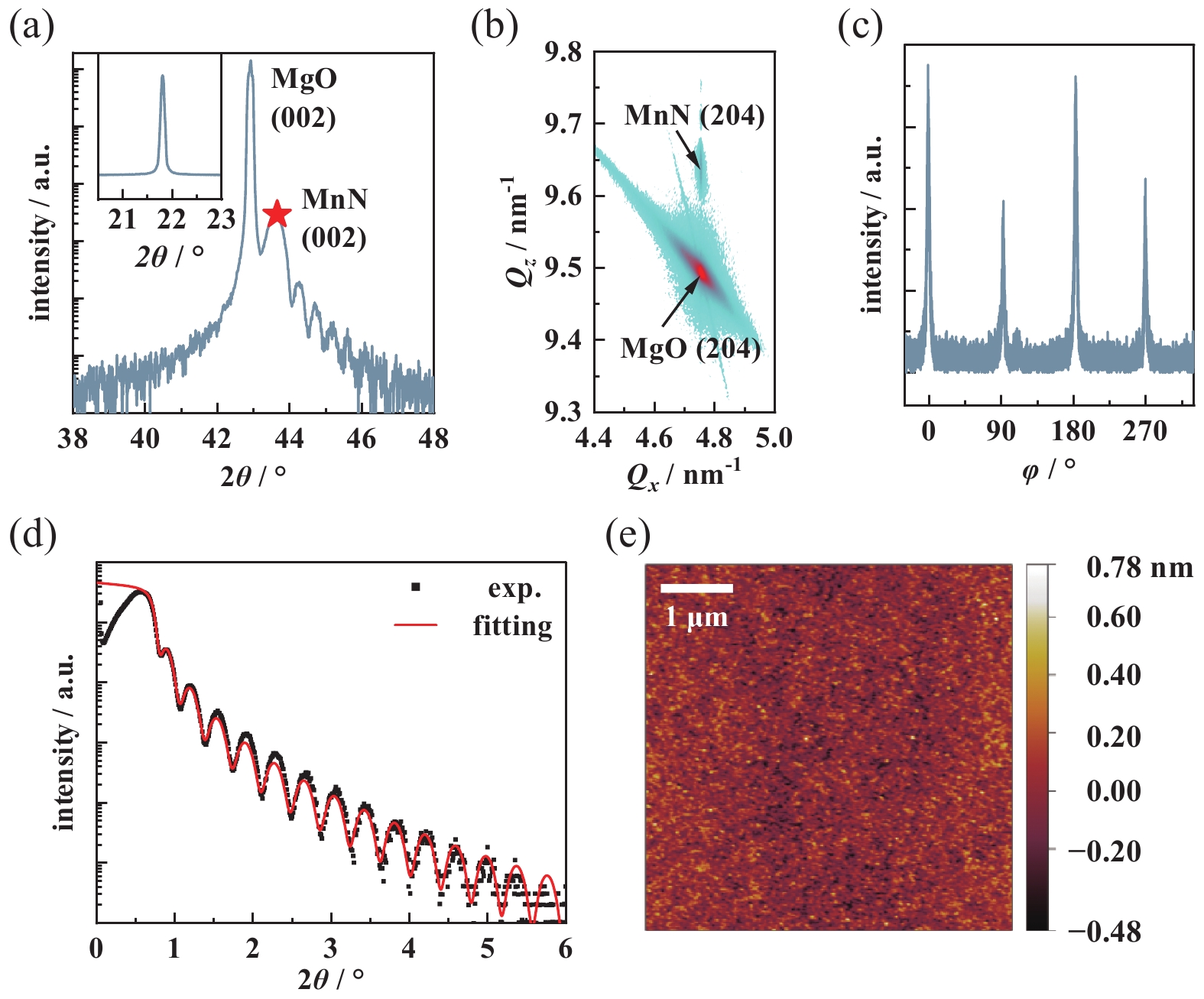 图 2 MgO(001)衬底上23纳米厚MnN薄膜的结构表征。(a)MnN(002)峰附近θ-2θ XRD谱图。插图是(002)峰的摇摆曲线,(b)MgO(204)峰附近的倒易空间成像,(c)MnN(204)峰的360° φ扫描,(d)X射线反射率谱,黑点和红线分别表示实验数据和拟合结果,(e)原子力显微镜得到的薄膜表面形貌图。a.u.为任意单位