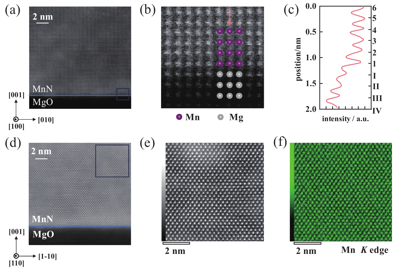 Figure 3. HAADF-STEM and EDS characterization of the MnN film. (a) HAADF-STEM image of the MnN film taken along the [100] zone axes of MgO, with a blue line indicating the MnN/MgO interface, (b) zoomed-in view of the blue-framed area highlighted in (a), (c) line profile of the intensity across the region marked by orange arrow in (b), (d) HAADF-STEM image of the MnN film taken along the [110] zone axes of MgO, with a blue line indicating the MnN/MgO interface, (e) zoomed-in view of the blue-framed area highlighted in (d), (f) EDS mapping of the Mn K-edge spectrum for the region shown in (e)