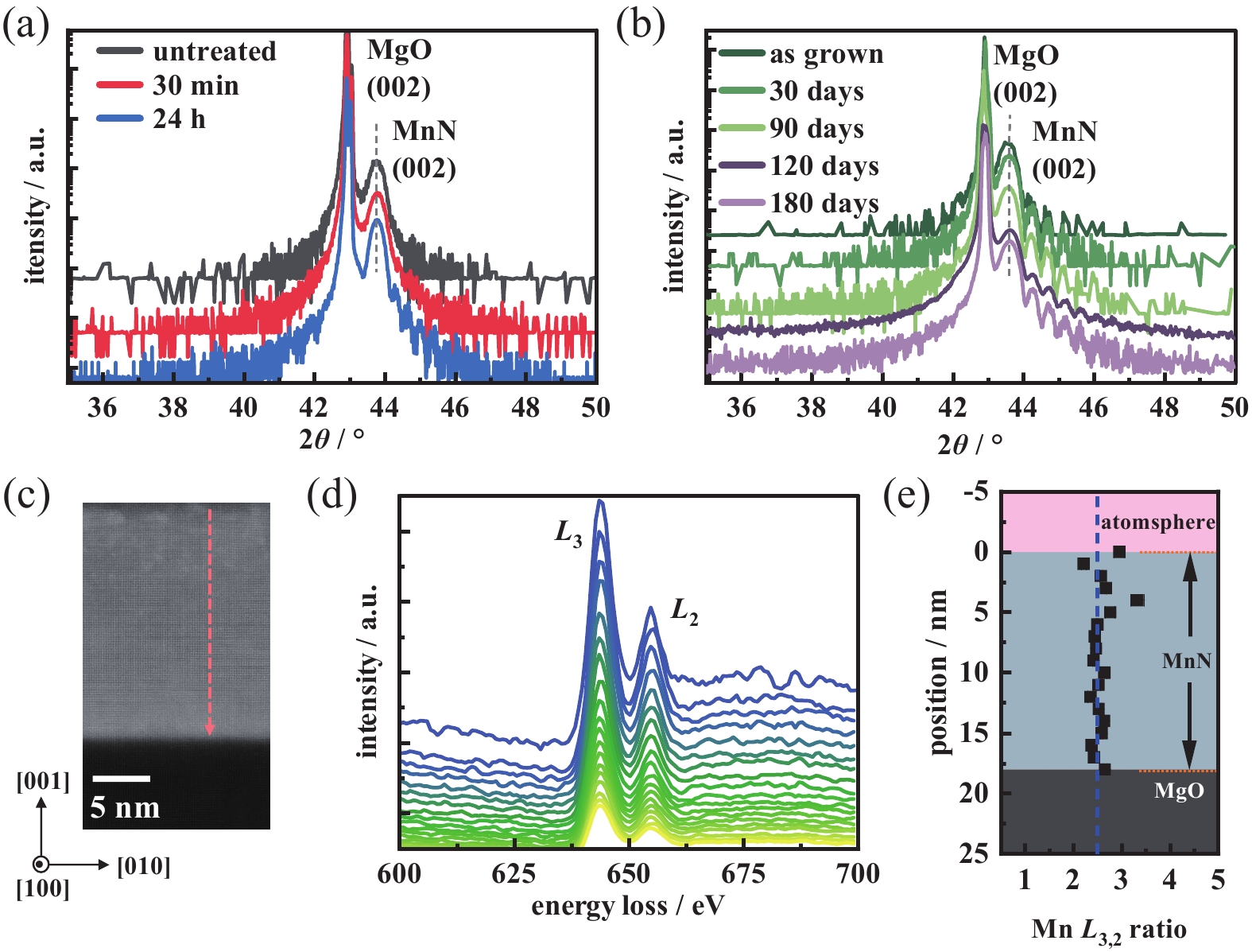 图 4 不同环境条件下MnN薄膜的稳定性表征。(a)不同水浸泡时间下MnN薄膜(002)峰附近的小范围θ-2θ XRD谱图,(b)薄膜制备后不同存放时间下MnN薄膜(002)峰附近小范围θ-2θ XRD谱图,(c)沿MgO衬底[100]带轴拍摄的MnN薄膜HAADF-STEM图像,(d)沿(c)图橙色标记区域的EELS分析,(e)Mn L3/L2带边的积分强度比值