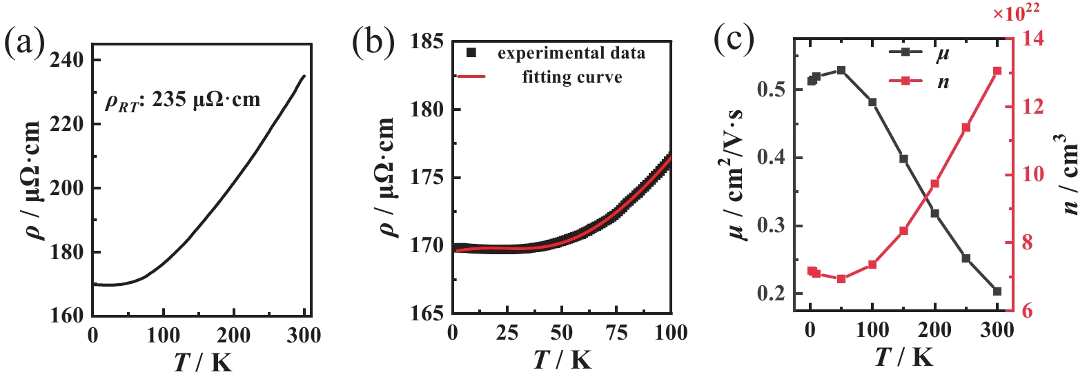 图 5 电输运特性。(a)电阻率−温度曲线,室温(300 K)电阻率值为235 μΩ·cm,(b)2−100开尔文温度区间内实验电阻率数据(黑点)和近藤效应模型的拟合结果(红线),(c)基于电输运测量得到的载流子浓度(n)和迁移率(μ)随温度的变化