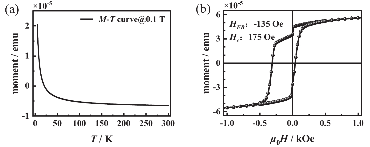 The AFM properties of MnN films are characterized through two steps. First, the magnetization curve is measured at a cooling field of 1 kOe (see Fig. 6(a)). Results show high-temperature diamagnetism and low-temperature paramagnetism of the MgO substrate, indicating the MnN film does not show obvious magnetization, consistent with the AFM configuration of MnN. Second, a 30-nm-thick sample is capped with a 1.5 nm ferromagnetic CoFeB layer, and the hysteresis loop was measured after an in-plane cooling field annealing process. Fig. 6(b) plots the experimental results, the saturation magnetization of the CoFeB layer is 5.9e−5 emu, and the unit saturation magnetization of the CoFeB layer is calculated to be 1573 emu/cc. According to the Meiklejohn-Bean model[48-49], the interfacial exchange energy between MnN and CoFeB layers can be calculated using the formula,
