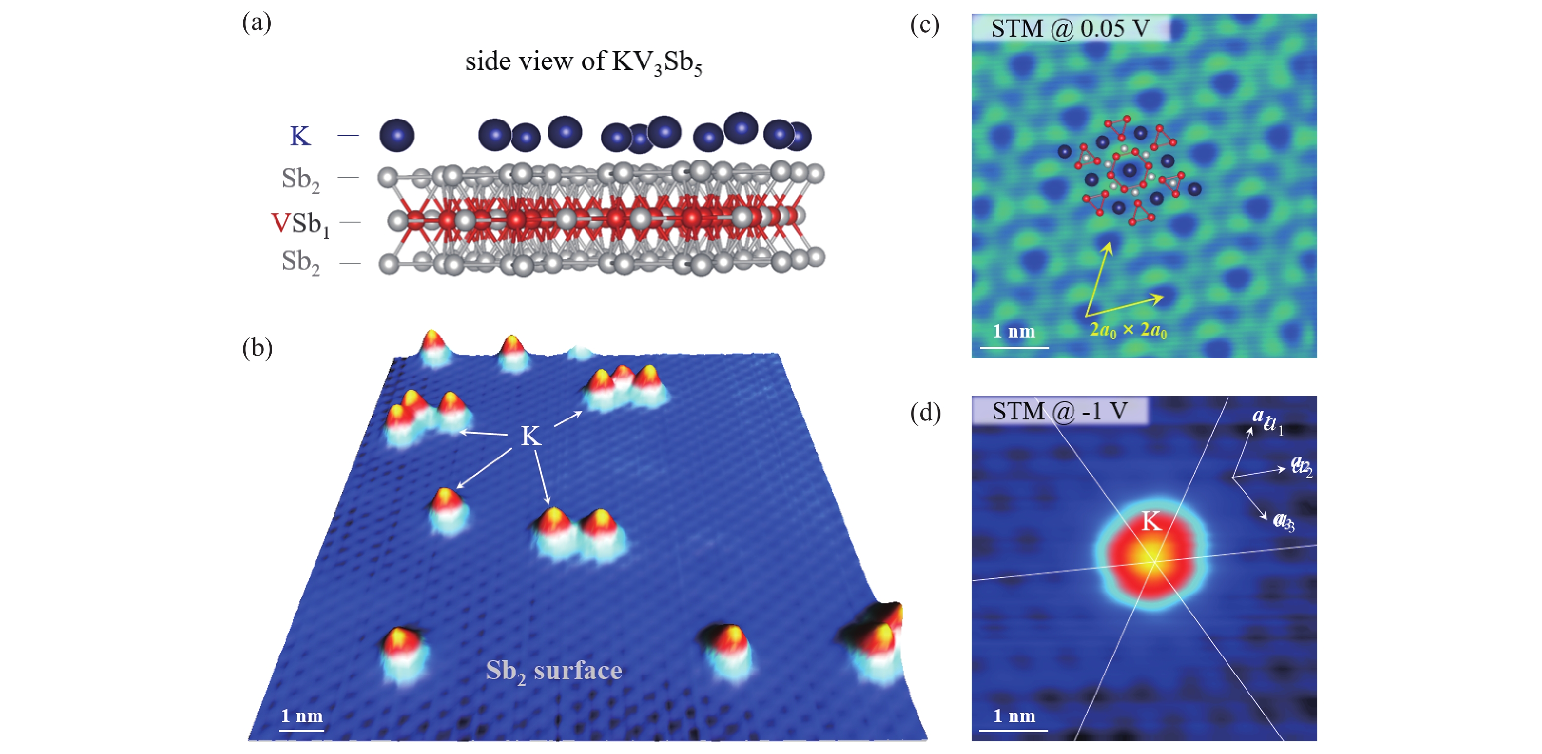 图 1 KV3Sb5的晶体结构。(a)KV3Sb5的晶体结构示意图:由钾(K)层、锑(Sb2)层和钒锑(VSb1)层交替堆叠形成的具有六方对称的晶体结构,(b)K原子在Sb2层表面的STM图,(c)具有原子分辨率的干净Sb2表面本征STM图像,具有2a0 × 2a0的超晶格结构,(d)K原子被吸附在Sb2表面晶格基矢(a1、a2、a3)的交点位置的STM图