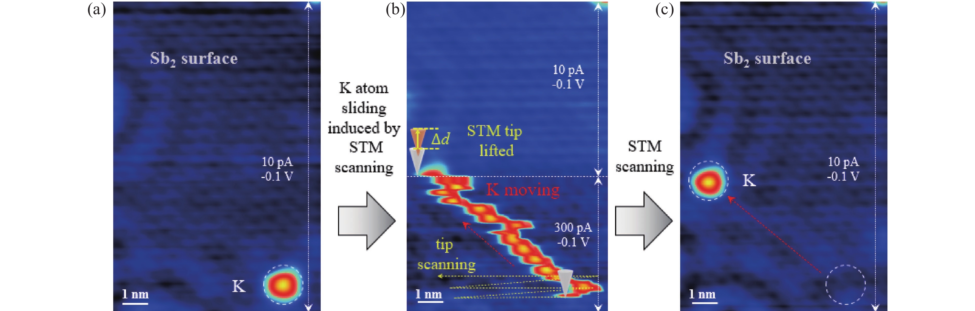 图 2 利用STM探针横向滑动原子操纵技术,实现Sb面上单个K原子操纵。(a)K原子在Sb2表面初始位置的STM图像,(b)STM探针在Sb2面上对K原子横向滑动操纵过程的STM图,K原子跟随STM探针进行周期性往复运动。STM图上半部分扫图参数为I = 10 pA,Vb = −0.10 V,STM图下半部分扫图参数为I = 300 pA,Vb = −0.10 V,(c)经过STM探针横向滑动操纵过程后,K原子在Sb2表面的最终位置的STM图像