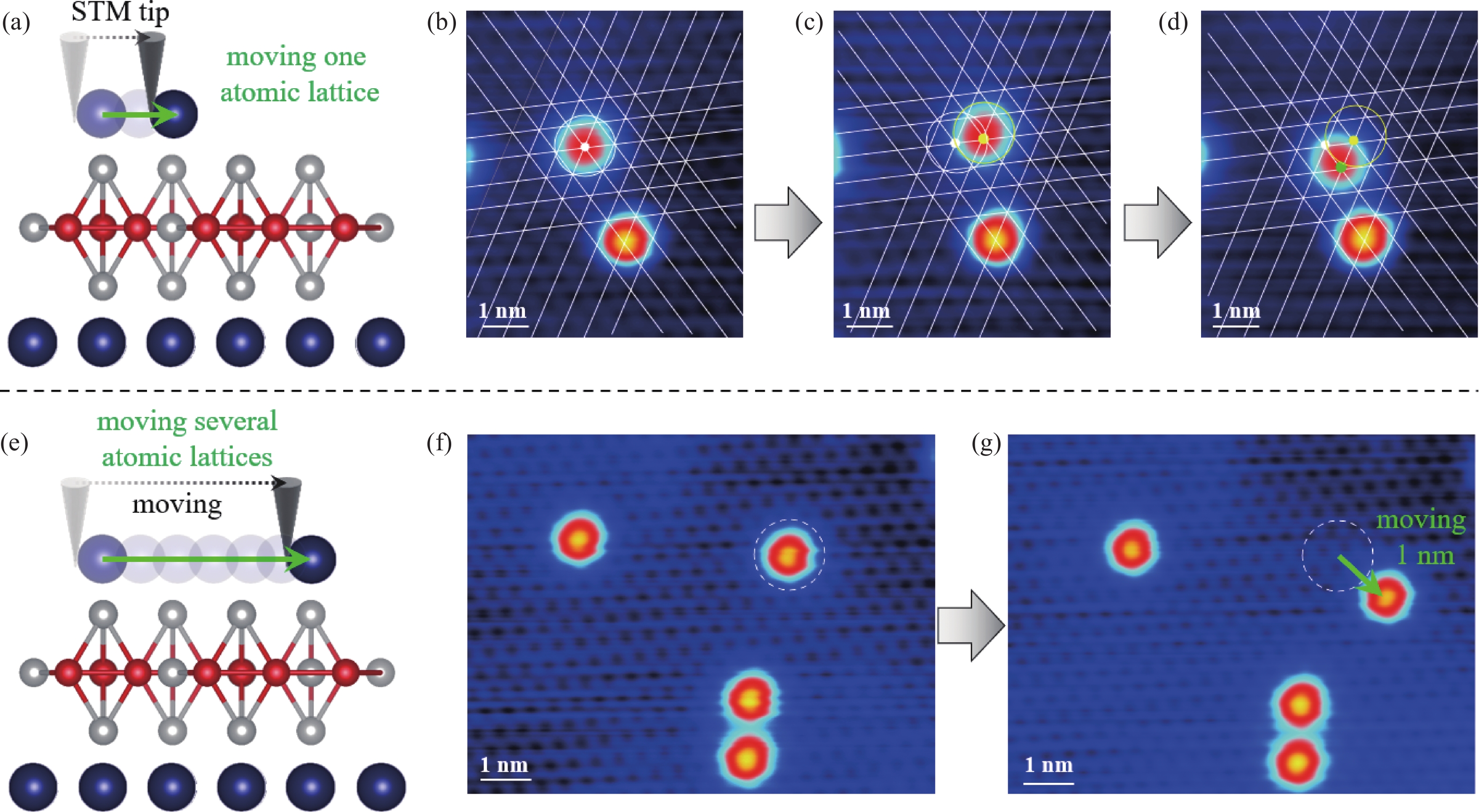 Figure 3. Ultrahigh-precision atomic manipulation of K atoms using the lateral pushing method with an STM probe. (a) Schematic illustration of moving a K atom between adjacent Sb lattice sites using an STM probe, (b)–(d) STM images showing the process of moving a K atom with single-lattice precision (about 5.5 Å) in different lattice directions using an STM probe, (e) Schematic illustration of moving a K atom over multiple lattice sites (about 2 nm) using an STM probe, (f), (g) STM images showing the process of moving a K atom over multiple lattice sites using an STM probe. In this process, the distance and direction of the K atom’s movement are completely consistent with the lateral movement distance and direction of the STM probe