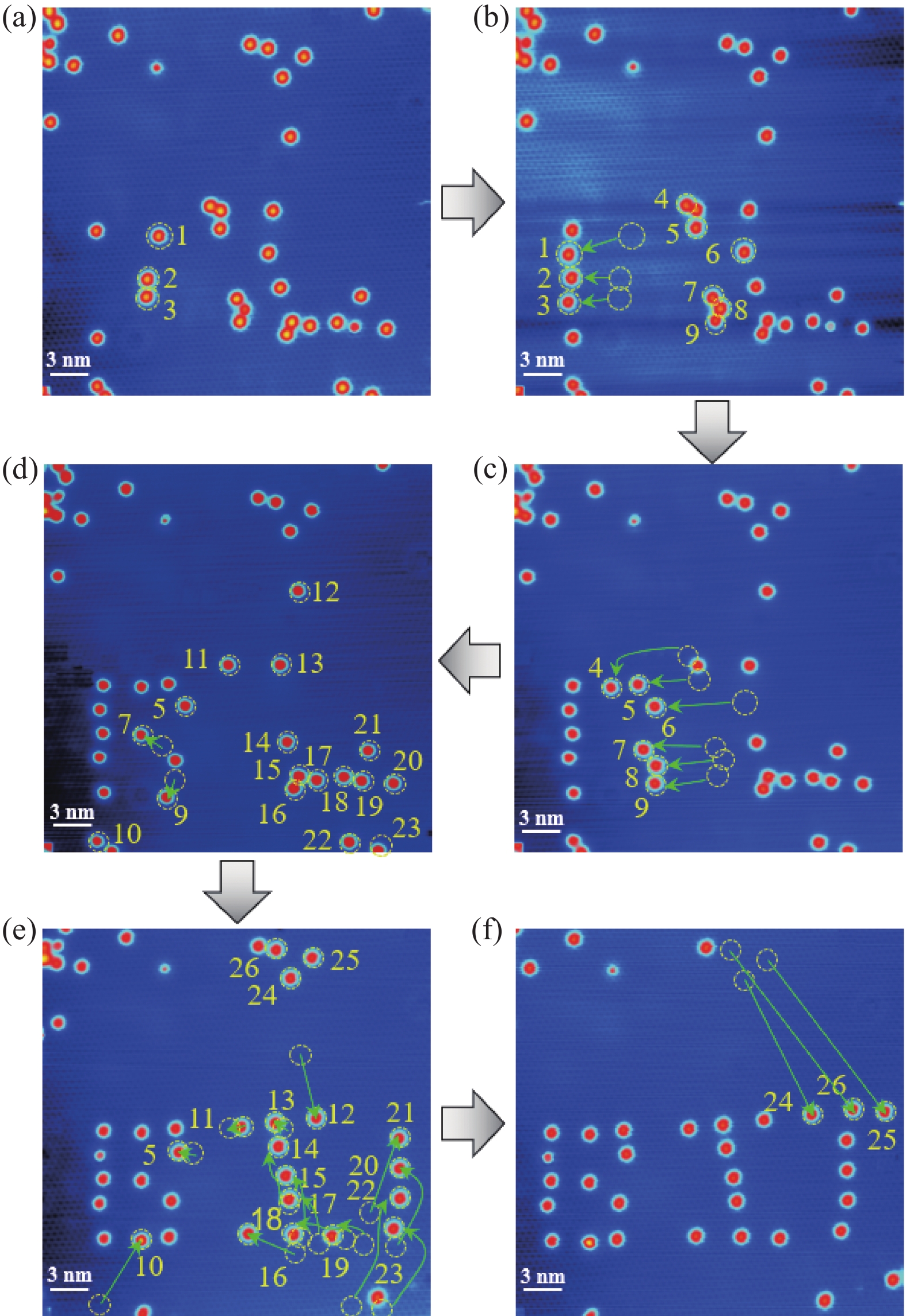 Figure 4. Achieving specific atomic patterns using STM probe atomic manipulation techniques. (a)–(f) Based on the atomic manipulation technique of lateral pushing with an STM probe, multiple K atoms were precisely laterally pushed on the Sb2 surface using an STM probe, successfully constructing a “BIT” nanoscale pattern