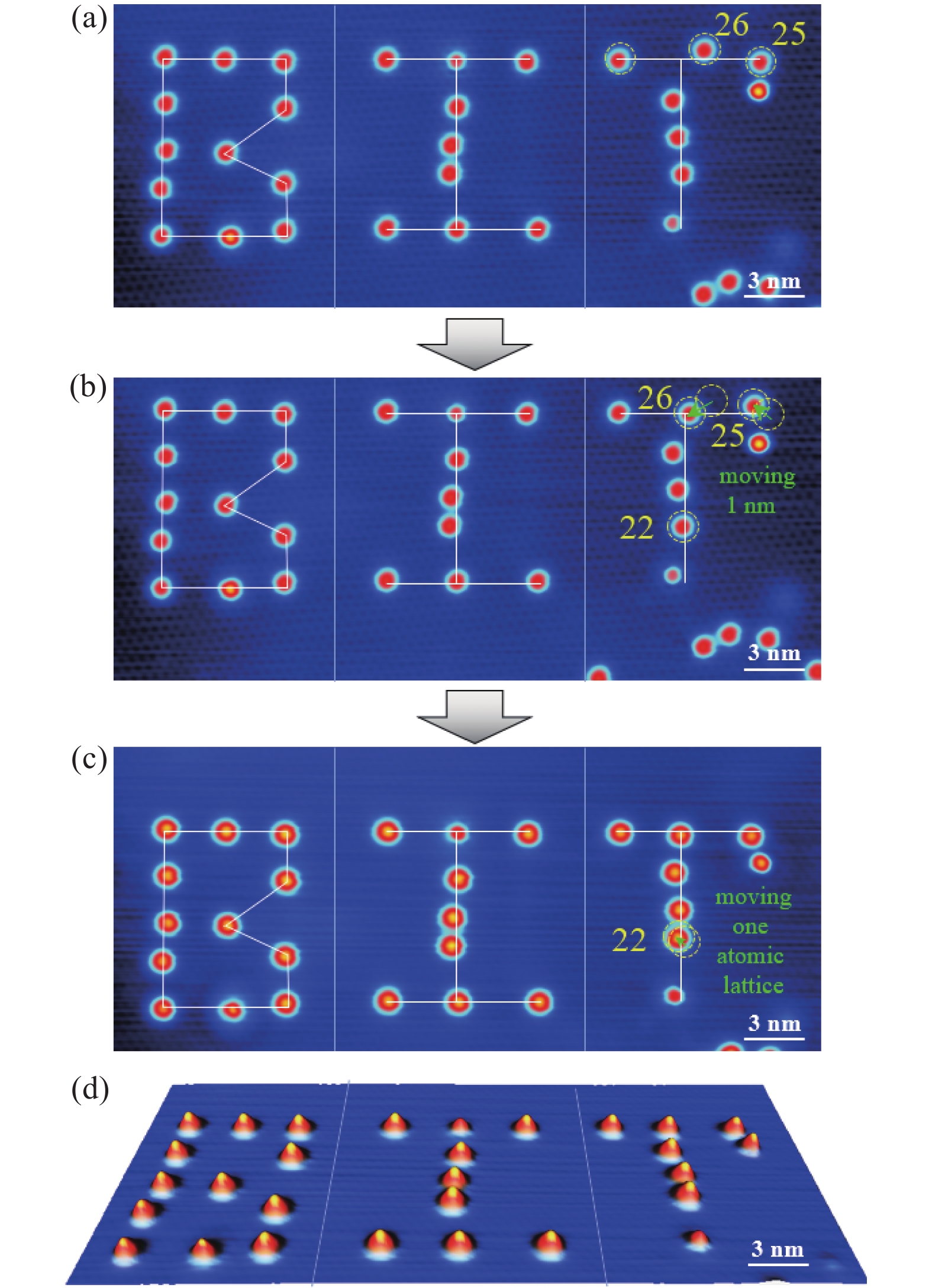 Figure 5. Utilizing STM probe to precisely adjust the positions of K atoms to construct a perfect “BIT” pattern. (a)–(d) STM images of the process of adjusting the roughly constructed “BIT” pattern with single-lattice precision to ultimately achieve a perfect “BIT” pattern