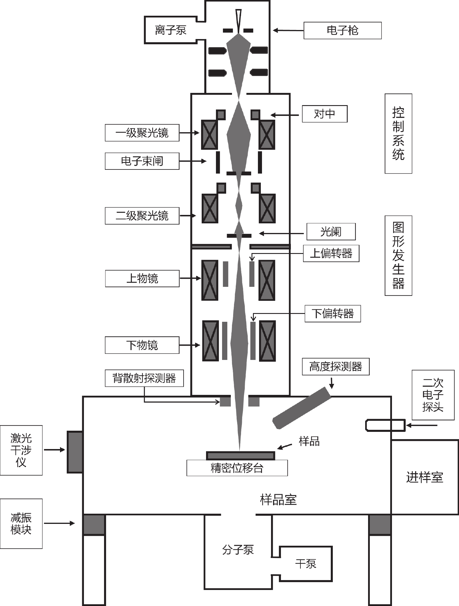 基于图1对EBL设备七大核心子系统的基本介绍,本小节将重点阐述其中四个重要子系统:EOS、工件台系统、图形数据处理系统以及真空控制系统。这四大子系统与设备的性能极限紧密合相关。深入剖析这些系统的核心技术,是理解并寻求提升EBL设备综合性能的关键路径。