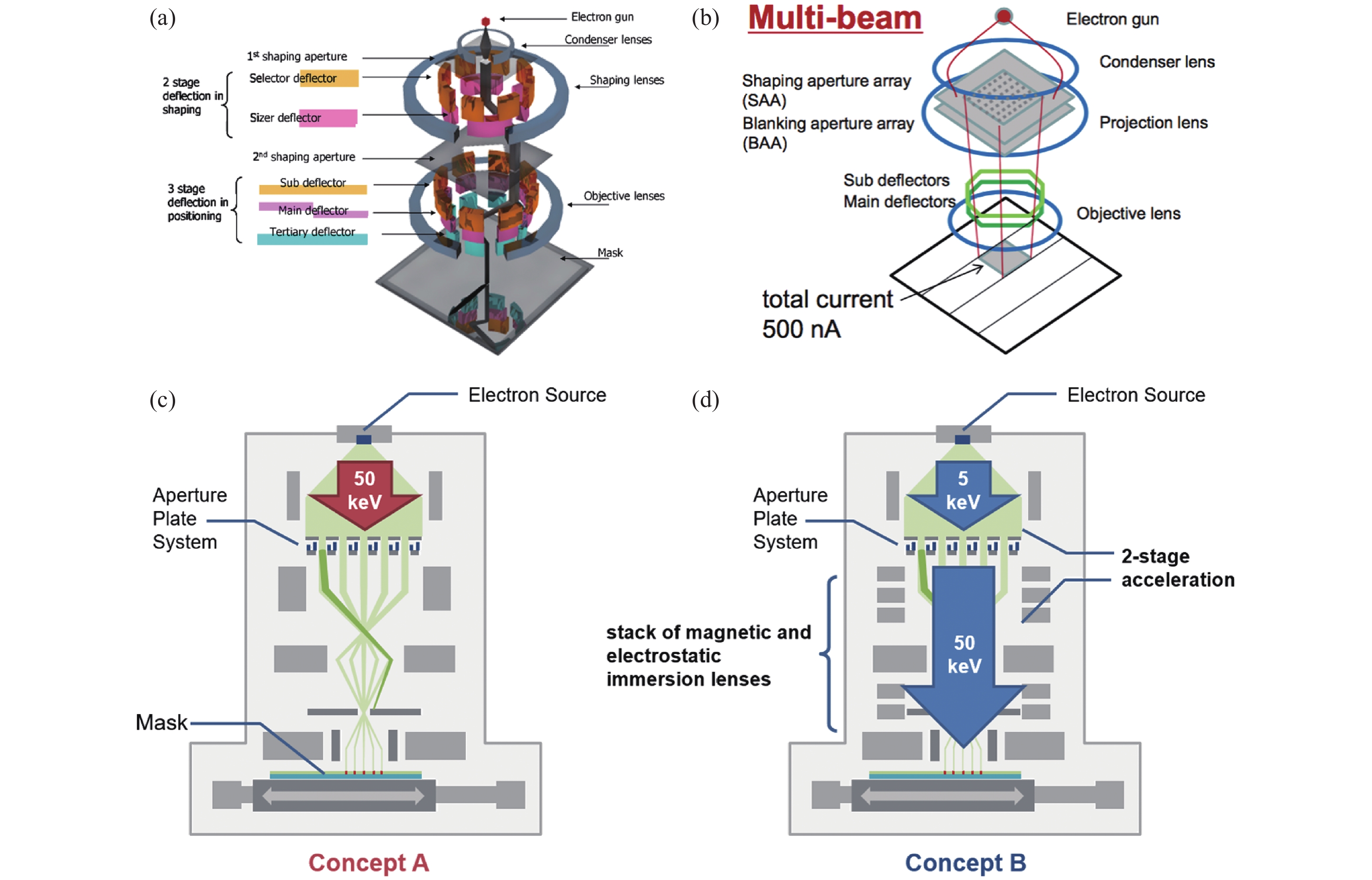 Figure 2. Schematic diagrams of VSB and MB-EBL systems. (a) Principle of the EBM-9500, a representative VSB-EBL system[21], (b) principle of the NuFlare MBM-1000[22], a representative multi-beam mask writer, (c) and (d) two design concepts of the MBMW-101, a representative MB-EBL system [18]