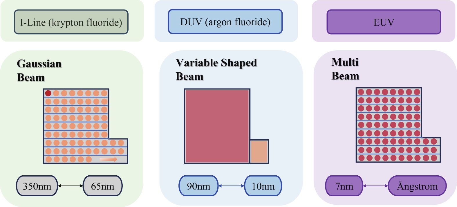 在当代高端EBL设备中,VSB型和MB型EBL已成为两大主流技术路径[19],分别可以对应深紫外(DUV)和EUV光刻时代对生产效率和加工精度的严苛要求。图3对比分析了三种主流EBL设备的技术路线[19],揭示了EBL技术从高斯束、VSB到MB的演进路径,该路径不仅体现了曝光模式由串行到并行所带来的效率飞跃,更反映了其加工精度从350 nm到7 nm乃至埃级尺度的巨大技术跨越。图中浅绿色部分展示了高斯电子束EBL的基本信息,如图内红色圆点所示,其以点状高斯束为基本曝光单元,通过逐点扫描的方式完成图形写入,其曝光模式印证了这一特性,这种技术的加工精度可类比于光学光刻中的I-Line波段(约350 nm−65 nm)。为提升写入效率,图中浅蓝色部分所示的VSB-EBL技术则采用可变的矩形电子束斑作为基本曝光单元对图形进行高效加工,其技术水平与DUV光学光刻相对应。而为了进一步突破产能瓶颈,图中浅紫色部分所示的MB-EBL技术通过并行控制大量微型电子束进行阵列化曝光,极大地提升了写入速度,其加工精度可达到7 nm甚至埃级尺度,作为对EUV光学光刻的重要补充与发展,是下一代光刻技术发展的关键技术。