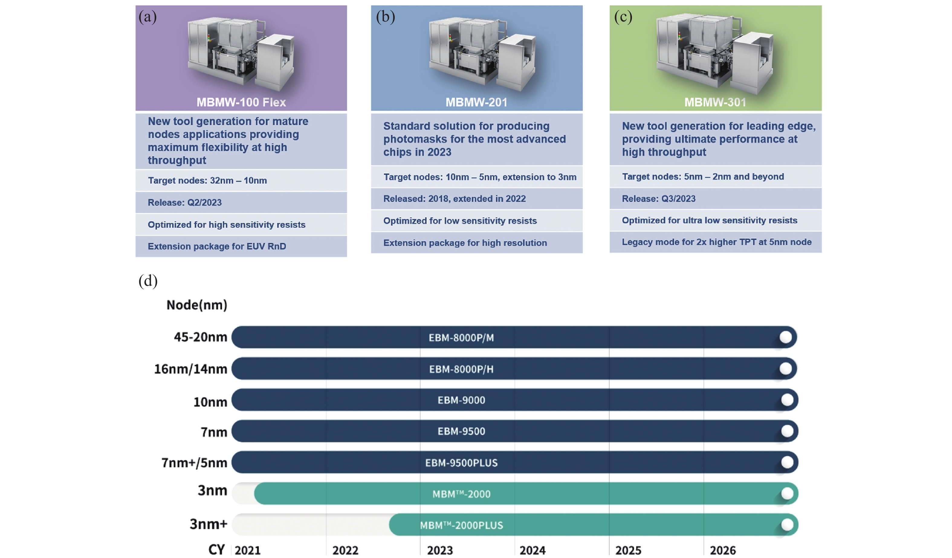 Figure 4. Development Roadmap of MB-EBL Systems. (a)-(c) Three representative generations of multi-beam EBL systems from IMS: MBMW-100 Flex, MBMW-201, and MBMW-301[18], (d) NuFlare's roadmap for novel EBL systems, which covers the future development of its MBM multi-beam platform as well as the technology path for its EBM (VSB-type) platform[20]
