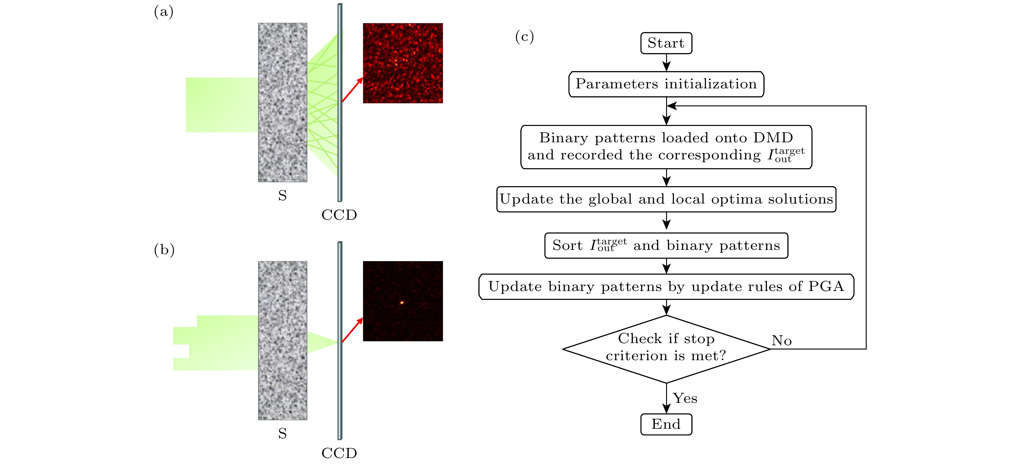 为抑制光学散射效应造成的成像分辨率较低的影响, 研究者们提出多种散射成像技术, 主要包括: 基于迭代优化的波前整形技术[11]、光学传输矩阵法[12]和光学相位共轭法[13]的散射成像技术. 基于迭代优化的波前整形技术被认为是众多散射成像技术中性价比较高的一种方法, 主要是利用优化算法通过不断迭代找到最优波前, 实现光透过散射介质的信息传递[14,15]. 在迭代优化过程中, 散射介质可以被看作是一个“黑匣子”, 无需考虑其散射特性. 另外, 这种反馈系统具有实验光路简单, 无需采集先验数据, 可以根据散射介质的状态进行实时反馈等优点. 2007年, Vellekoop和Mosk [16]首次利用反馈优化算法结合空间光调制器(spatial light modulator, SLM)实现光透过强散射介质的聚焦, 最终获得相较于优化前散斑亮度提高1000倍的焦点, 远超出光学透镜能够达到的聚焦效果, 这项工作拉开散射光场调控的序幕. 2010年, Vellekoop 等[17]利用迭代优化波前整形技术实现光透过散射介质聚焦, 焦点的直径仅为传统光学透镜聚焦点的1/10大小, 突破光学透镜的衍射极限. 随着研究的深入, 研究者们对迭代波前整形技术的时效性和抗噪性能提出更高的要求. 2012年初, Conkey和Brown[18]首次将遗传算法(genetic algorithm, GA)引入到散射光场的调控中. GA在执行过程中将SLM上各调制单元的相位值进行整体优化, 极大地提高了波前整形的效率和稳定性. 通过与传统的连续相变算法(continuous sequential algorithm, CSA)相比, 数值模拟和实验结果都表明GA在噪声环境中的增强因子仍具有非常明显的优势. 虽然在之后的研究中提出大量的优化算法用于散射光场聚焦, 但由于GA对噪声的不敏感性, 被认为是散射光场调控领域最受欢迎的方法[19–21]. 在实际应用中, 散射介质的特性变化较快且周围通常存在很强的干扰, 这就需要所用的方法既要有较快的调控速度又要很强的抗噪声能力.
