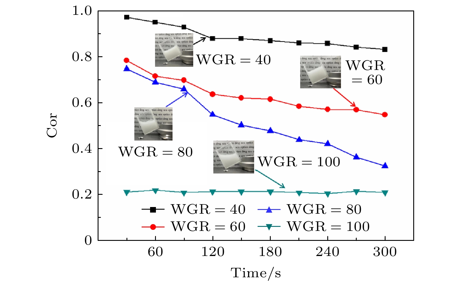 在本实验中, 使用的散射介质分别是WGR为40, 60, 80和100的胶体. 为了说明不同WGR散射介质的散射特性变化情况, 每隔30 s测一次散斑特性, 并计算其与初始散斑之间的皮尔逊相关系数(Cor), 表达式如下:
