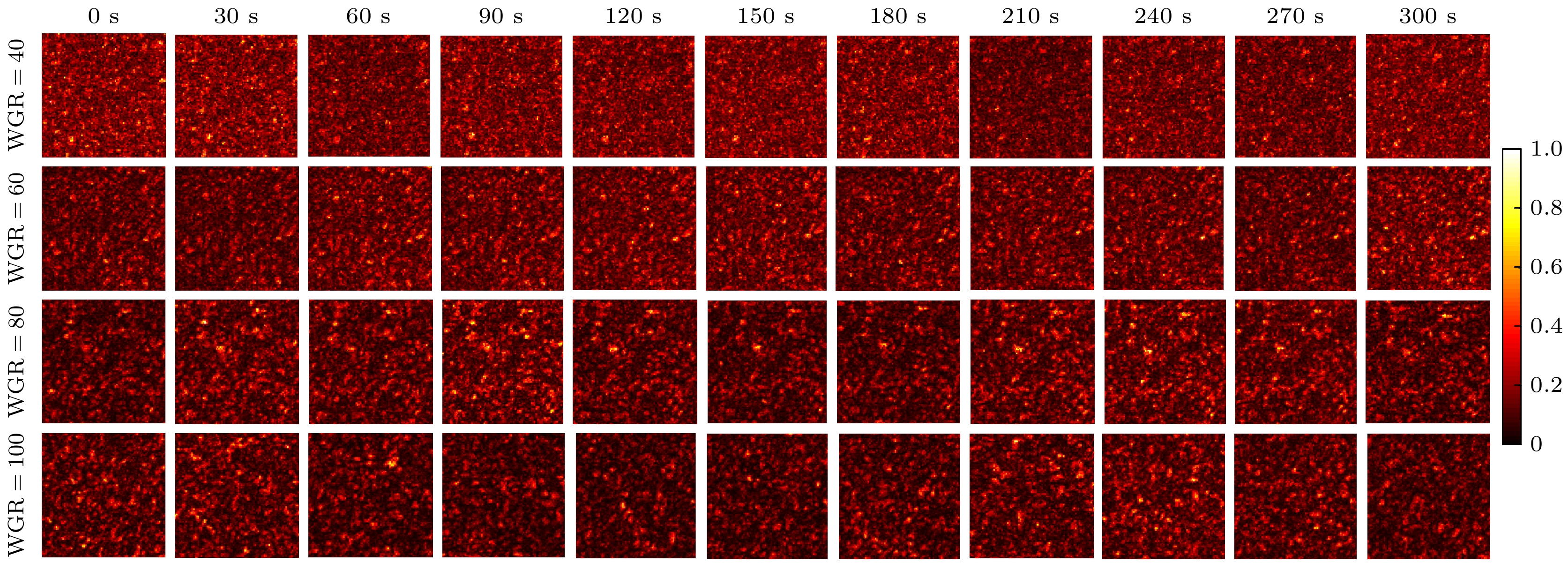 $ {x_{i, j}} $ 为每隔30 s 时间CCD捕获到的散斑数据,$ {y_{i, j}} $ 为0 s时CCD捕获到的初始散斑数据,$ \overline x $ 和$ \overline y $ 分别是$ {x_{i, j}} $ 和$ {y_{i, j}} $ 的平均值, i和j分别是CCD捕获到散斑图像的横纵坐标. 图2是在不同WGR条件下测量300 s得到的Cor变化曲线. 为了减小由随机性引起的误差, 每条曲线是20次实验的平均结果. 从图2可以看到, WGR值越大, Cor值变化越快, 散射介质的持续时间越短(散射介质的持续时间是指散斑状态维持稳定的时间[25,26]). 这主要是由于明胶越少, 胶体的黏性越小, TiO2在胶体中受到的束缚力越小, 分子运动的变化就越快, 使得散射介质的散射特性变化越快. 图3是在不同WGR下每隔30 s测得的散斑形状. 值得注意的是, WGR = 100时, 从图3展示的介质状态可以看出, 散射介质已经处于一个流体状态, 说明胶体的黏性很低, 介质中的TiO2在快速地进行无规则运动. 此时, 在CCD上观察到散斑的变化非常快, 其状态可在极短的时间内发生变化. 经过测量后, 发现无论经过多长时间得到的散斑图与最初散斑图之间的Cor值一直维持在0.2左右, 这主要是因为Cor值的获得是通过计算两张散斑图中对应像素点之间的相关性得到. 虽然散斑的变化很快, 但CCD拍到的散斑图背景之间仍存在一定的相关性, 这就使得Cor值一直维持在某个数左右. -