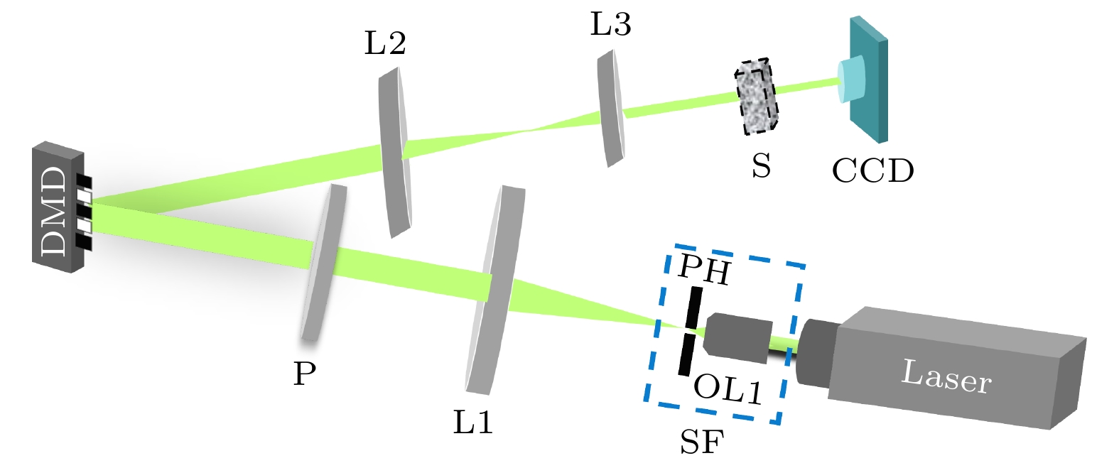 光透过不同WGR的TiO2散射介质的聚焦实验装置如图4所示. 首先, 用波长为532 nm的连续激光器(MSL-FN-532 nm-200 mW, CNI)产生一束准直光束, 准直后的光束经过物镜OL1(40×, NA = 0.65)进行扩束, 扩展后的光束中心部分通过一个直径为25 μm的小孔PH. 图4蓝色框中的组件(OL1和PH)形成一个空间滤波器(SF). 然后将透过小孔的光束通过透镜L1 (f = 250 mm)产生一束平行光. 该平行光束用于覆盖DMD (型号: V-9601, Aunion Tech Co., Ltd.)的掩码区域, DMD和L1之间的线偏振片P用于调节投射到DMD上的光强度. 经DMD调整后的光束通过 透镜L2 (f = 200 mm)和L3 (f = 50 mm)缩束, 缩束后的光波照射到散射样品(S)的前表面, 透过散射介质的散射光由一个分辨率为600 × 960像素的CCD (型号: Point Grey Research, Blackfly BFLY-U3-23S6M, 8 bit)收集. DMD的分辨率为1920 × 1200像素, 刷新频率为16.393 kHz. DMD中心像素周围1024×1024像素的范围作为实验过程中的有效调制区域. 每个像素的大小为10.8 μm × 10.8 μm, 而且每个像素的可以被随机分配的值为0或1. CCD的工作范围为中心像素周围256 × 256像素, 每个像素的大小是8 μm × 8 μm.