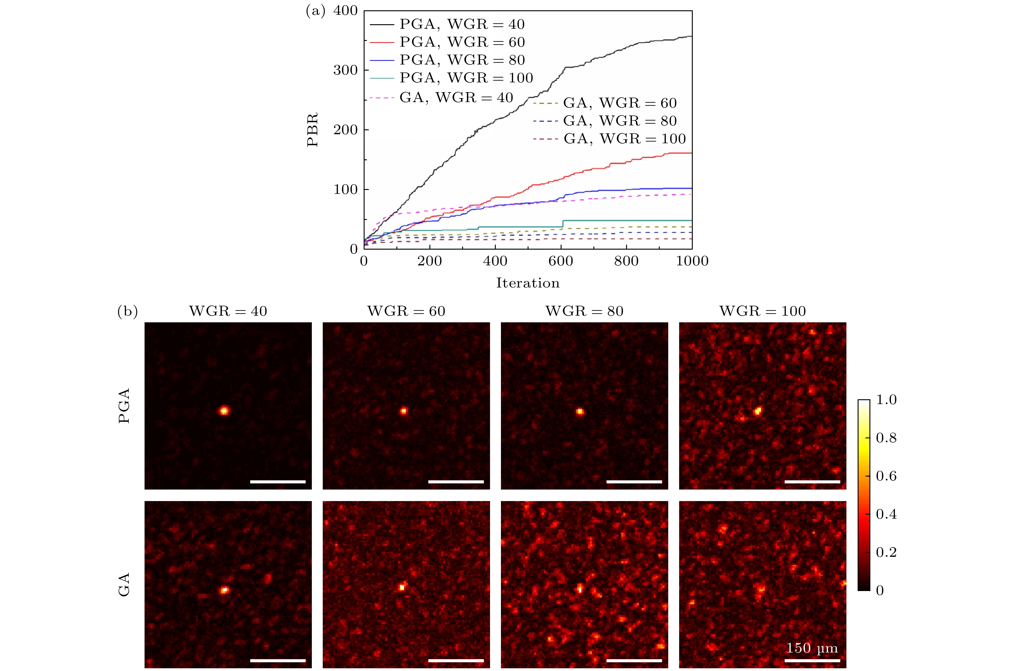 图5是PGA和GA在种群数为20, 经过1000次迭代后得到的单点聚焦实验结果. 单点聚焦的目标函数是峰背比(peak-to-background ratio, PBR), 表达式如下: