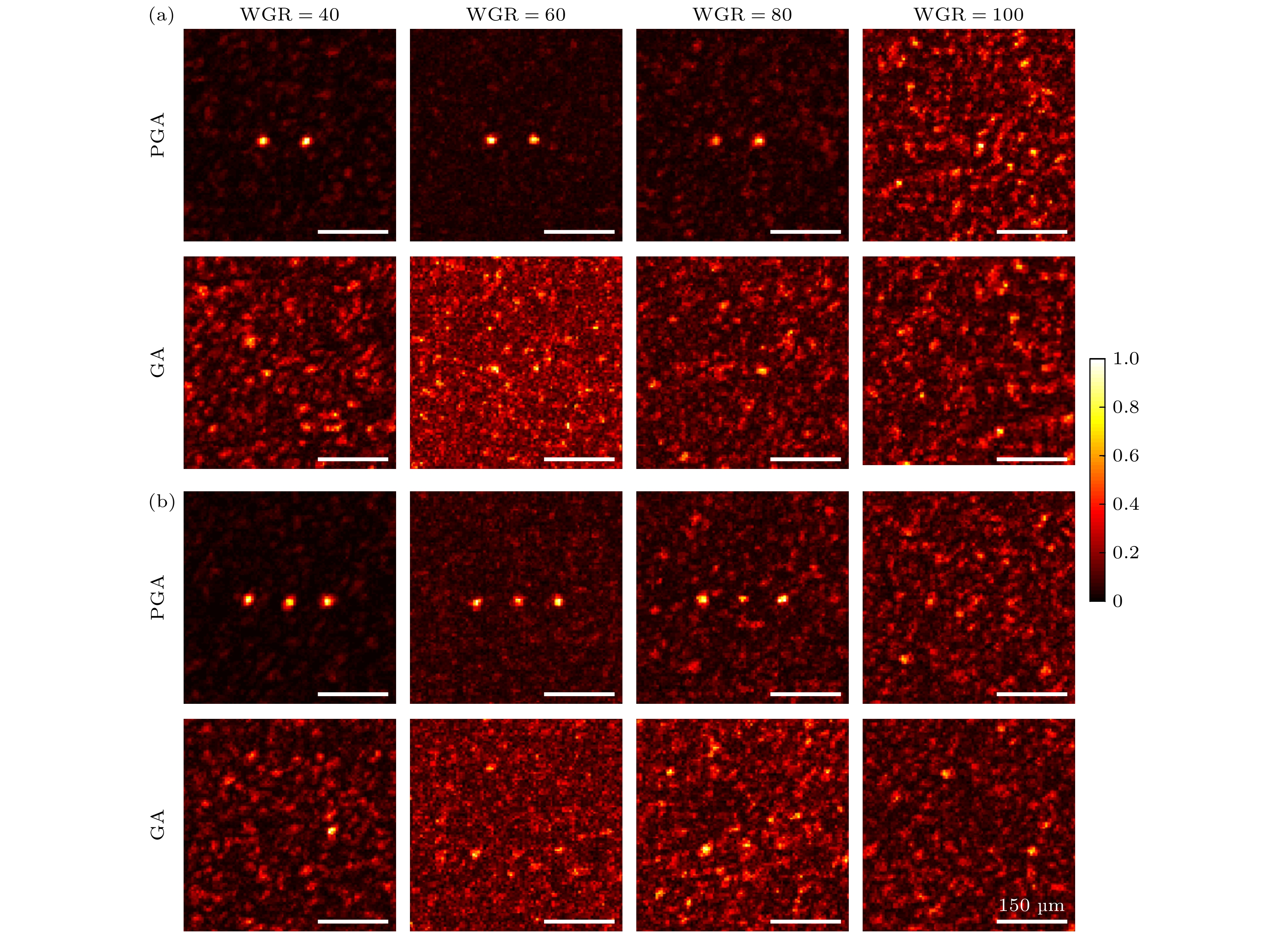 $ I_{{\text{out}}}^{{\text{target}}} $ 是目标区域的光强度,$ {I_{{\text{ref}}}} $ 是背景的平均强度. 图5(a)是在不同WGR下PBR值随迭代次数的变化. 通过对比发现在相同WGR的条件下, PGA的PBR值增长速度总是快于GA. 而且, WGR = 80的PGA经过1000次迭代获得的最高PBR值仍比WGR = 40的GA要高. 图5(b)是PGA和GA在1000次迭代过程中的最佳聚焦模式. 可以看到, 在WGR = 80时, GA的焦点已被散斑所覆盖, 而PGA在WGR = 100时仍可以找到比较清晰的焦点. 以上实验结果均说明, PGA的抗噪声能力要优于GA, 而且PGA的收敛速度也快于GA. 值得注意的是, 由于硬件采集速率的限制, 实验中PGA和GA迭代1000次的运行时间几乎相同.为了进一步说明PGA对透过不同WGR散射介质的光场调控能力, 进行了多点聚焦实验, 目标函数如下: