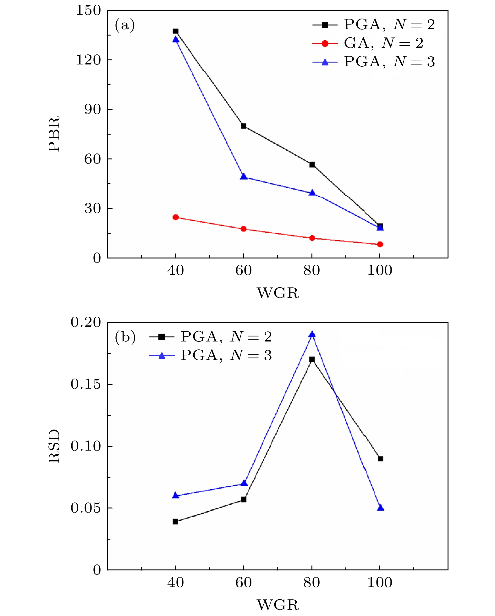 $ I_{{\text{out}}}^{{\text{target}}, n} $ 是第n个焦点目标区域的光强度,$ {I_{{\text{ref}}}} $ 是背景的平均强度. 图6是PGA和GA在经过1000次迭代后2点聚焦和3点聚焦的最佳结果. 从图6可以看到, GA在进行多点聚焦时几乎是没有调制结果的, 而PGA只有在面对WGR = 1/100快速变化的散射光场时, 多点聚焦实验才会失败. 这主要是由于在进行多点聚焦时, 算法更易受外界条件干扰的影响. 从这一点也说明PGA的抗干扰能力要强于GA. 图7(a)是不同WGR下, 多点聚焦时各焦点的平均PBR的变化曲线. 从图7(a)可以看出: 平均PBR值与WGR值成正比; 对于PGA, 平均PBR值随着焦点个数的增加在减小. 这主要是由于焦点个数越多, 优化过程越复杂, 算法对外界的干扰也越敏感, 这就使得单个焦点能达到的最大PBR值变小. 为了评估各多点聚焦焦点亮度的均匀性, 计算了不同WGR下PGA焦点PBR的相对标准偏差(relative standard deviation, RSD), 结果如图7(b). RSD值越小, 焦点强度越均匀. 在可完成多点聚焦的情况下, RSD值与WGR值成反比, 主要是由于WGR值越小, PGA受到外界干扰越明显, 多点聚焦的效果就越差, 这就使得各焦点强度之间的均匀性越差. 而在WGR = 100时, RSD的值突然变小, 这主要是由于PGA对光场几乎没有调控作用, 各焦点目标区域的强度几乎等于优化前的强度. -