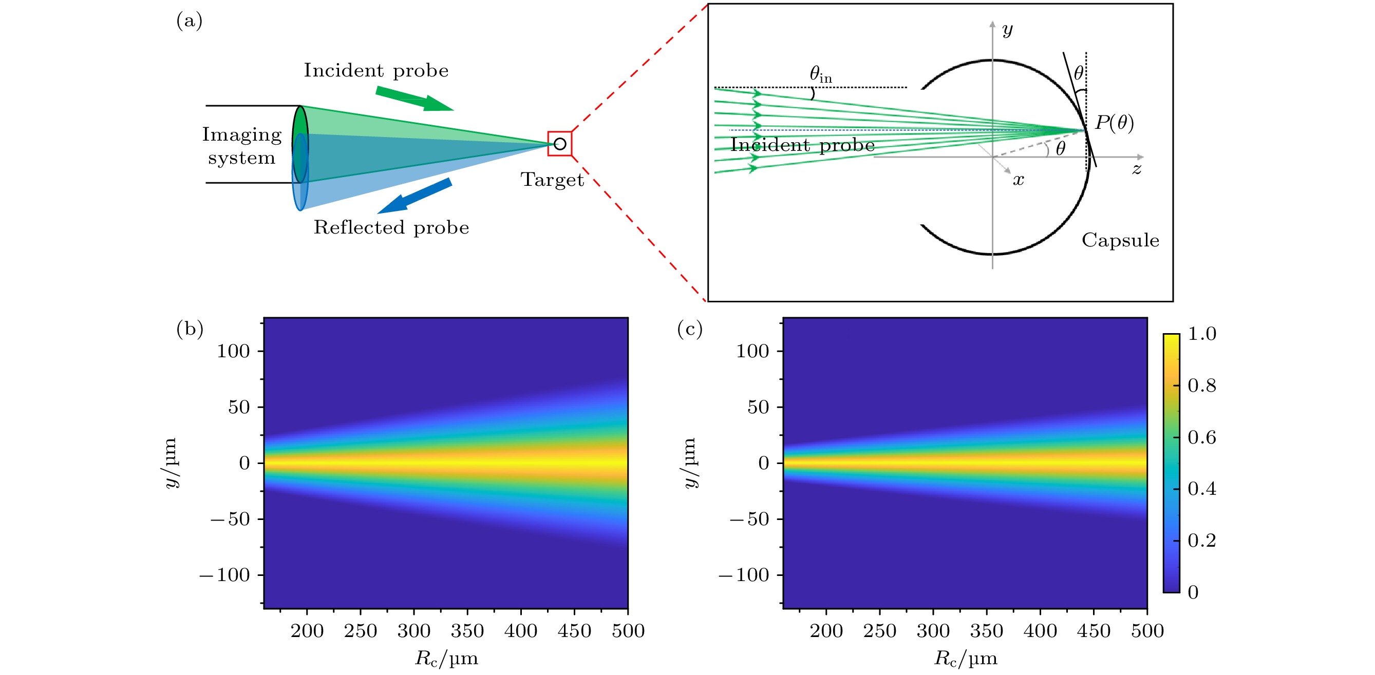 将(7)式代入(6)式, 可以获得球位型下不同空间位置的VISAR数据光强. 图1展示了上述理论计算的不同球形反射面半径下, VISAR测量方向上不同空间位置的光强图, 图1(b)和图1(c)分别对应成像系统F数分别为3和4.5的结果. 可以看到F数固定的情况下, 不同空间位置的光强分布呈中间强两侧弱; 随着收光系统F数的减小, 即对应入射立体角和收光立体角的增大, 可观测区域也将增大. 定义图像有光强的位置为VISAR可观测区域, 可以看到, 随着反射球面的半径变小, 可观测区域不断变小, 这是由于随着半径变小, (7)式计算的倾角θP不断变大导致.