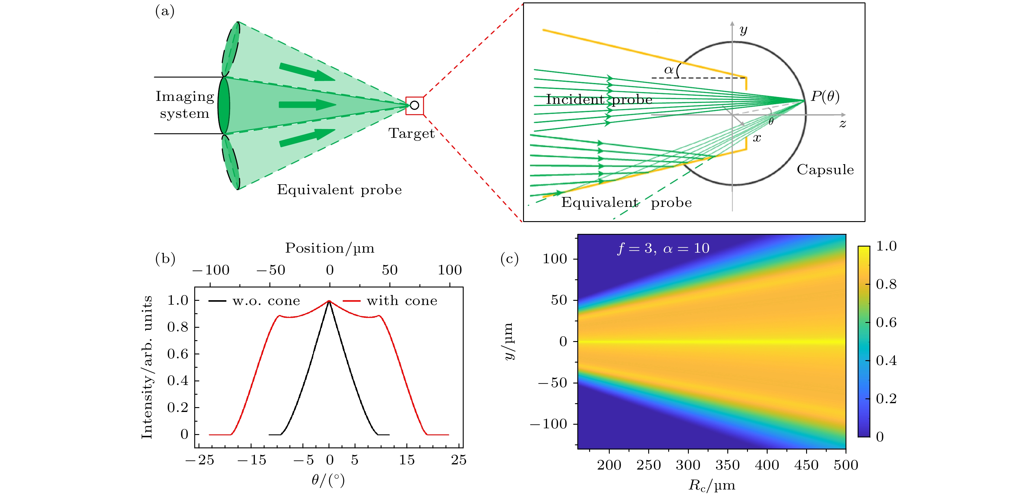 我们提出利用keyhole靶的金锥锥壁反射效应等效地降低入射探针光的汇聚F数, 实现VISAR测量区域增大的技术路线. 如图2(a)所示, 引入一个角度合适的金锥, 此时探针光除了直接入射靶丸中的待测位置, 还会通过金锥反射入射待测反射面, 即等效于增加了一个额外光源, 如图2(a)中虚线区域所示, 从而增加了入射光的角度范围. 假设锥面半锥角为α, 则等效探针光源增加的入射角度范围有