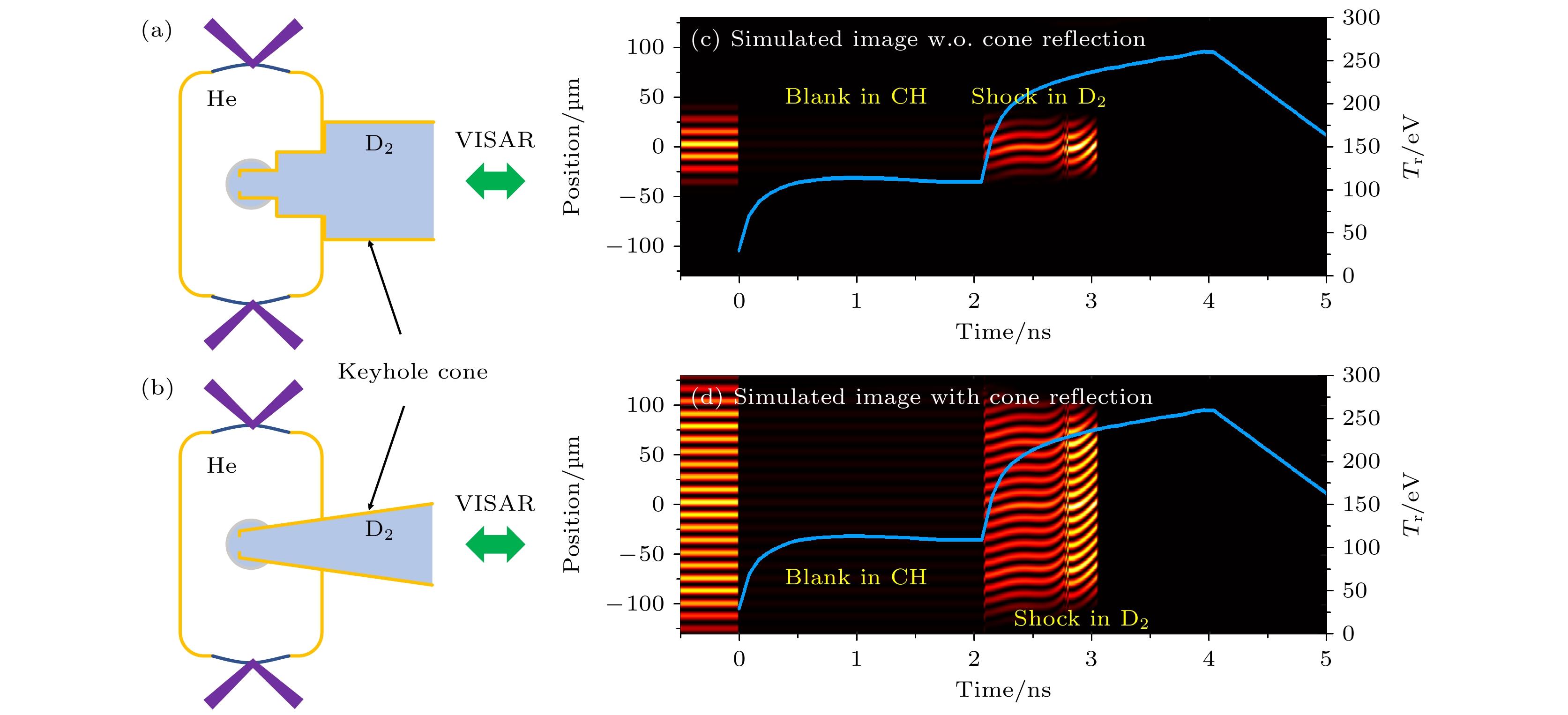 为了验证金锥对VISAR诊断图像测量区域的提升效果, 在激光聚变研究中心的十万焦耳激光装置上开展了基于液氘keyhole靶的冲击波调控实验. 图3为实验原理示意图. 实验中48路激光束分两端注入黑腔内产生高温X射线辐射场, 辐射场烧蚀碳氢(CH)靶丸产生球形汇聚冲击波在靶丸中传输. 实验采用的激光波形为典型双台阶整形激光, 产生的辐射驱动波形如图3(c)和图3(d)中蓝色实线所示. 实验用靶为keyhole靶结构, 如图3(a)和图3(b)所示, 黑腔大小为Φ2600 μm×4100 μm, 两端注入孔为1400 μm, 黑腔注入孔由0.5 μm的碳氢薄膜密封, 内充有3个大气压的He气以减缓激光焦斑处的烧蚀等离子体向黑腔中心的移动速度. 黑腔上安装了一个伸入靶丸中的金锥, 金锥顶部开260 μm诊断孔, 靶丸和金锥内充满液氘, 采用带倾角的石英窗口进行密封. 实验中分别采用金锥半锥角为0°和10°的keyhole靶开展实验, 来验证金锥对VISAR诊断图像测量区域的提升效果. 靶丸为壳厚65 μm、内径750 μm的球形靶丸, 靶丸外表面镀120 nm厚的铝膜. 诊断方面采用平响应XRD[22,23]监测时间分辨的黑腔辐射温度. 采用VISAR诊断系统进行冲击波测量, 探针光通过金锥顶部诊断孔入射靶丸内部来测量冲击波速度历程.