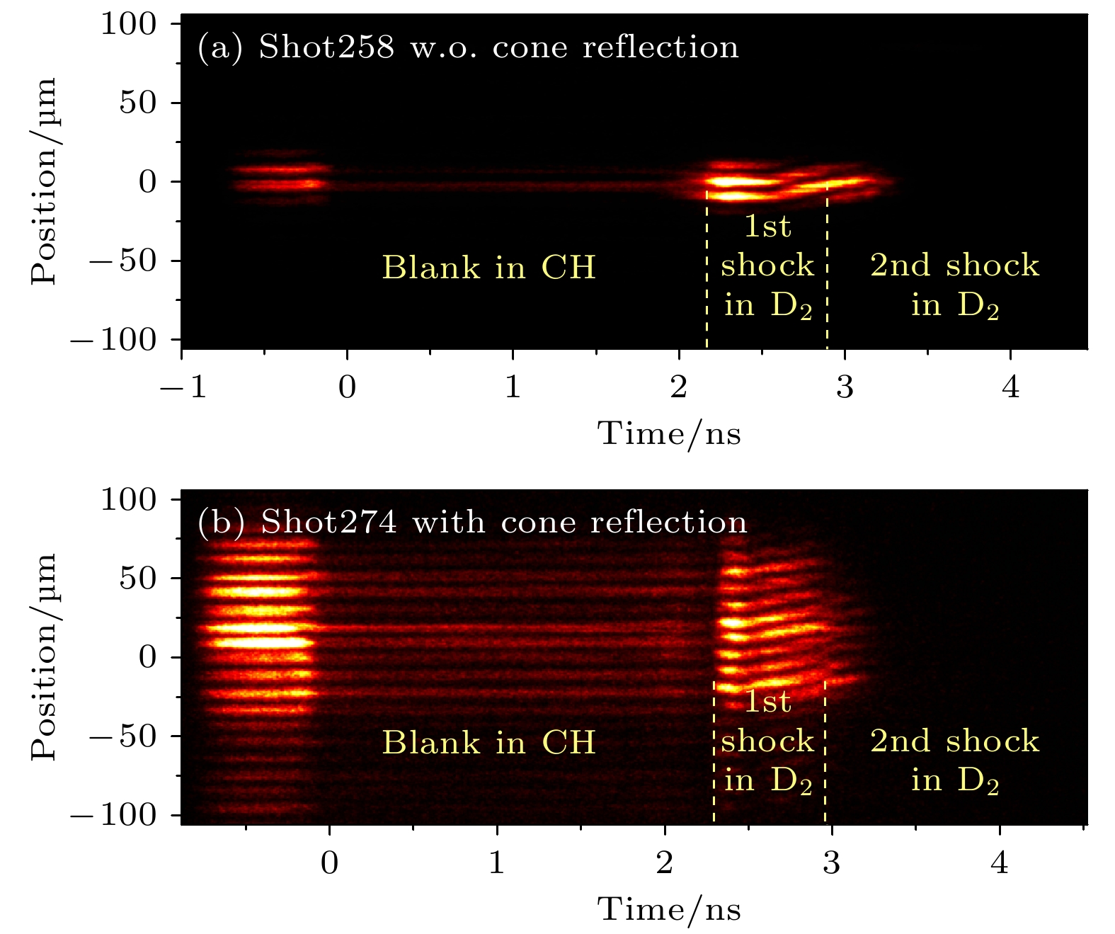图4展示了我国十万焦耳装置上基于低温液氘靶的冲击波调控实验结果. 实验通过VISAR诊断获得了冲击波在靶丸液氘中的传输图像, 图4(a)和图4(b)分别是两种keyhole锥角的冲击波调控实验获得的VISAR原始图像. 首先看VISAR图像的空间区域, 可以看到, 利用金锥反射后VISAR测量区域有显著提升, 这和图3中的模拟图像一致. 在锥角为0°时, VISAR图像只存在于中间区域, 宽度约50 μm, 比仿真预测还要少, 干涉条纹数目仅2—3根, 这对高质量数据获取及分析带来了较大的风险性; 在利用10°张角的金锥反射效果后, VISAR图像的测量区域增加至约180 μm, 条纹数目显著增加, 不仅消除了小靶丸尺度条件下VISAR测量失效的风险, 同时有效降低了VISAR测量图像中常见的小区域随机散斑等噪声干扰的影响[27]. 实验结果直接验证了利用金锥反射效应等效降低汇聚光源F数, 进而实现小靶丸尺度下球面冲击波传输的VISAR诊断区域显著提升的技术路线的有效性.