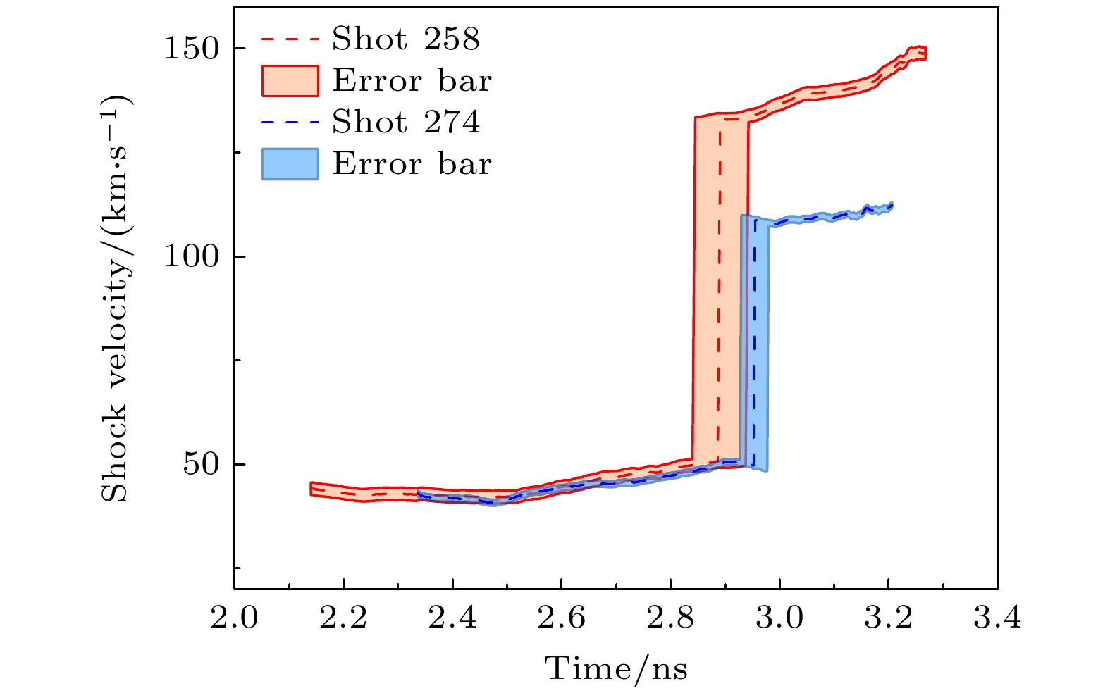 从图4的时间演化过程可以看到, 两发次实验VISAR图像在时间演化上均可以分为三个阶段. 第一阶段是主激光注入前, VISAR反射信号主要来源于CH层外表面的Al膜反射, 由于激光脉冲设置了0.5 ns的烧膜预脉冲, 烧膜剩余能量提前注入黑腔壁产生X射线会破坏Al膜, 所以在–0.15 ns左右Al膜静态信号即完全消失. 第二阶段是冲击波在CH层中传输时的图像, 第一台阶激光注入黑腔产生的辐射场压缩靶丸, 在CH中产生冲击波, 但此时激光注入黑腔产生的高能X射线将波前未压缩CH离化, 导致对532 nm波长的探针光完全吸收[24], 此时VISAR无法对CH中冲击波进行测量, 因此测量到的VISAR数据信号来源于CH-液氘界面的弱反射. 第三阶段是2.2 ns后冲击波从CH中穿出进入液氘后在液氘中传输时的图像. 由于液氘对X射线吸收效应极弱, 因此对探针光仍然保持很好的透明性, 同时冲击下的液氘出现金属化现象具有较好的反射性质[25,26], 此时VISAR数据信号全部来源于液氘冲击波阵面的反射. VISAR干涉条纹随着液氘中冲击波速度的变化而发生偏移, 两发图像可以看到冲击波在液氘中的完整追赶过程. 图5展示了两发图像数据处理后获得的液氘中的冲击波速度历程, 可以看到, 利用了金锥反射效应的274发数据, 在速度不确定度和时间判别不确定度方面均有明显提升. 冲击波速度不确定度由258发次的±1.5 km/s减小至0.74 km/s, 时间判别不确定度从±50 ps减小至25 ps. 最终由此获得的冲击波汇聚位置的不确定度由258发的±2.8 μm降低至±1.3 μm, 该技术的应用显著地提升了多冲击波追赶的精密表征能力.