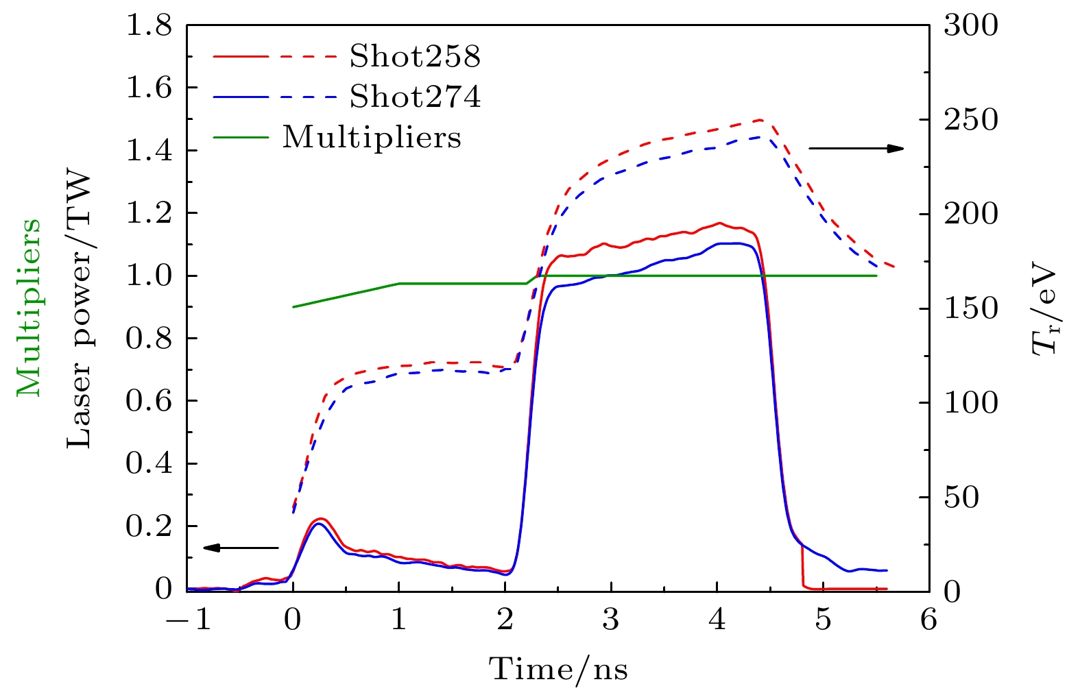 从图4的原始图像和图5的数据处理结果可看到, 两发实验的物理过程是基本一致的, 但双冲击波的速度历史定量上存在显著差异. 两发次液氘中的第一冲击波速度基本一致, 均在40 —50 km/s范围内, 但258发次的冲击波进液氘时刻、冲击波追赶时刻均比274发次略早, 追赶后的第二冲击波也存在较大差异, 258发次追赶后冲击波速度约133 km/s, 274发次追赶后只有108 km/s. 为了分析两者差异的原因, 首先对比了两发次实验的靶丸实际参数, 258发内径746.0 μm, CH壳层厚64.0 μm, 274发内径749.0 μm, CH壳层厚63.6 μm, 两发次靶丸参数差异均小于0.5%, 具有很好的一致. 然后对比了激光注入波形及黑腔辐射温度, 如图6所示. 由图6可以看到, 两发次激光第一台阶脉冲(即预脉冲)功率中258发较274发稍高, 稍高的功率和258发冲击波进液氘时刻更早、速度略高的现象是自洽的; 第二台阶脉冲(即主脉冲)功率相差较大, 258发比274发的平均功率高约10%, 对应的峰值辐射温度高约2.5%, 定性上似乎和258发冲击波追赶时间更早、追赶后速度更高的现象是自洽的. 但我们从量上估计, 辐射温度2.5%的差异远不足以导致实验观测到的冲击波速度差异超过20%.