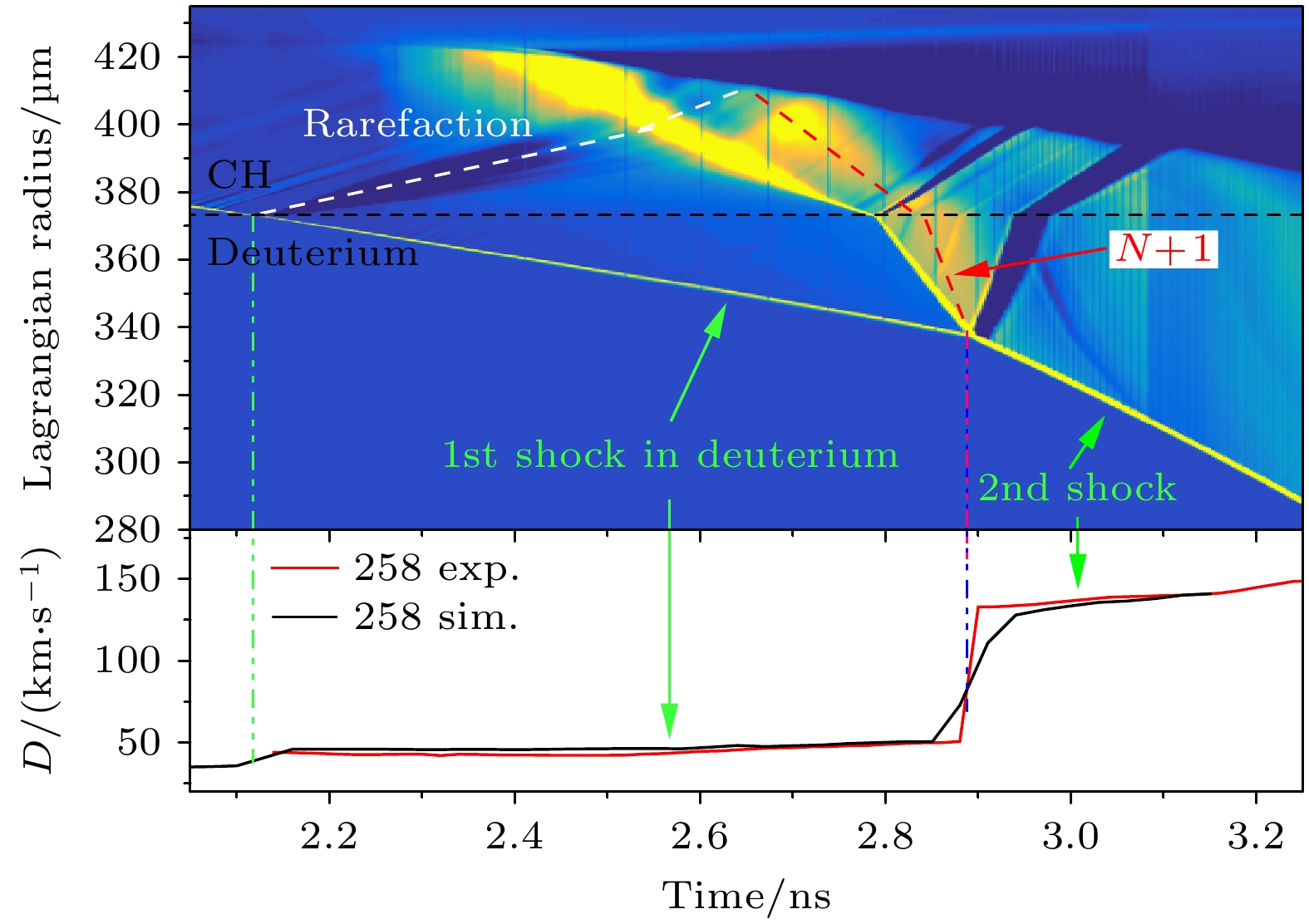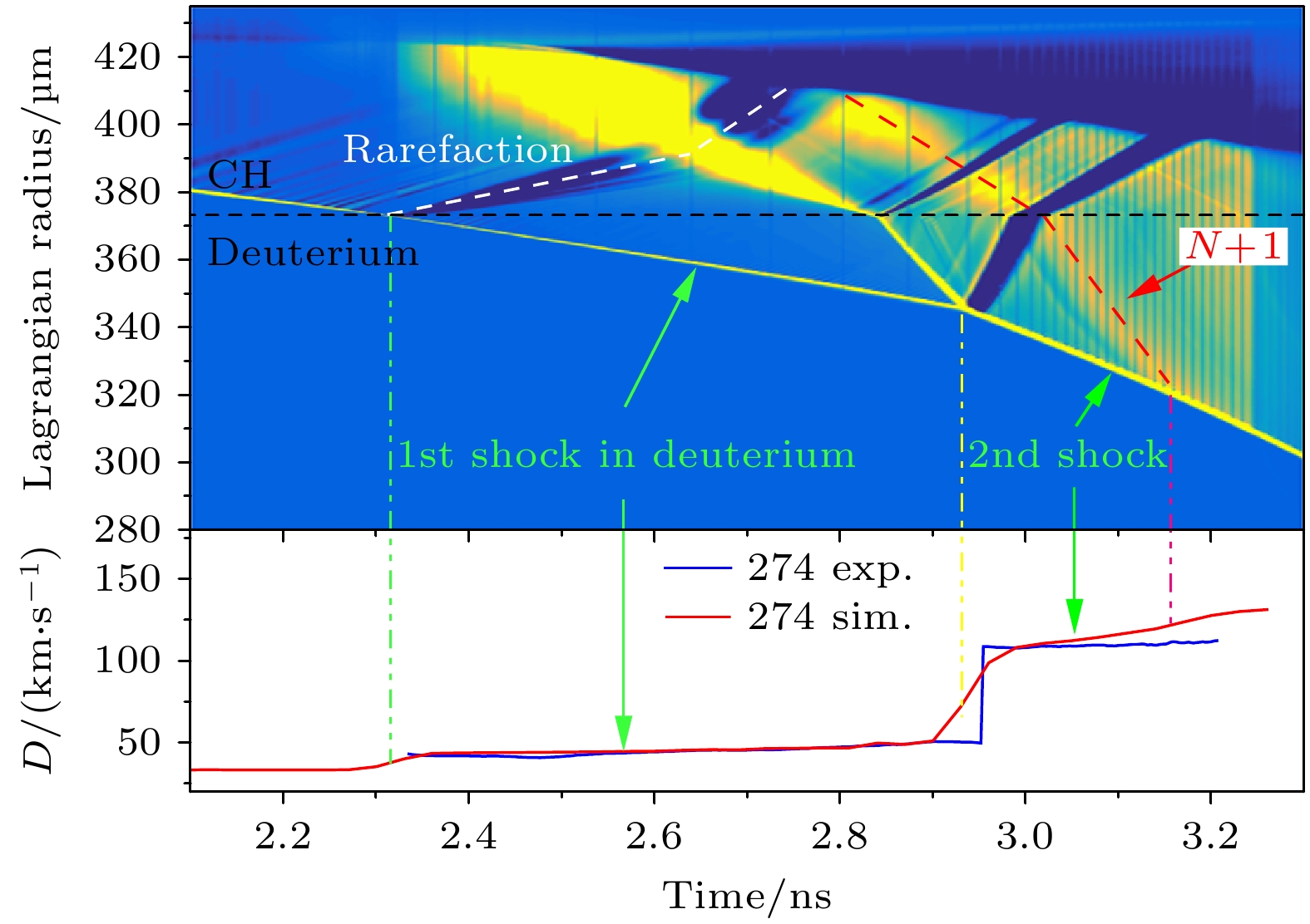 为了理解实验中第二冲击波速度历史的差异, 进一步分析了靶丸冲击波速度演化过程. 图7和图8分别展示了两发次的模拟结果, 同时给出了模拟获得的冲击波传输过程的压强梯度流场图, 可以清晰看到第一冲击波和追赶后第二冲击波的传输轨迹. 另外, 从图7和图8的模拟流场图可以看到, 第一冲击波穿过CH/液氘界面时, 由于阻抗失配的原因, 向液氘中传输一个冲击波的同时也会向CH中传输一个稀疏波(rarefaction), 如图中白色虚线所示; 稀疏波传到烧蚀面产生增压作用再向靶丸内产生一个反射冲击波, 也称为“N+1”冲击波[30], 如图红色虚线所示. “N+1”冲击波追上波头会产生显著的加速现象. 258发和274发由于预脉冲激光功率的差异, 导致258发第一冲击波进液氘的时刻以及产生稀疏波的时刻比274发早; 同时由于主脉冲功率的差异, 258发次的“N+1”冲击波比274发更强. 最后导致258发的“N+1”冲击波提前追赶, 并和双台阶辐射驱动产生的第一、第二冲击波同时汇聚, 导致追赶后的冲击波速度偏强; 而274发“N+1”冲击波追赶发生在第一、第二冲击波汇聚之后更晚的时间, 如图8所示, 所以实验测的汇聚冲击波传输过程还没有受到“N+1”冲击波影响. 因此, 我们认为两发次追赶后第二冲击波的速度差异主要是由于“N+1”反射冲击波的传输过程差异引起的.