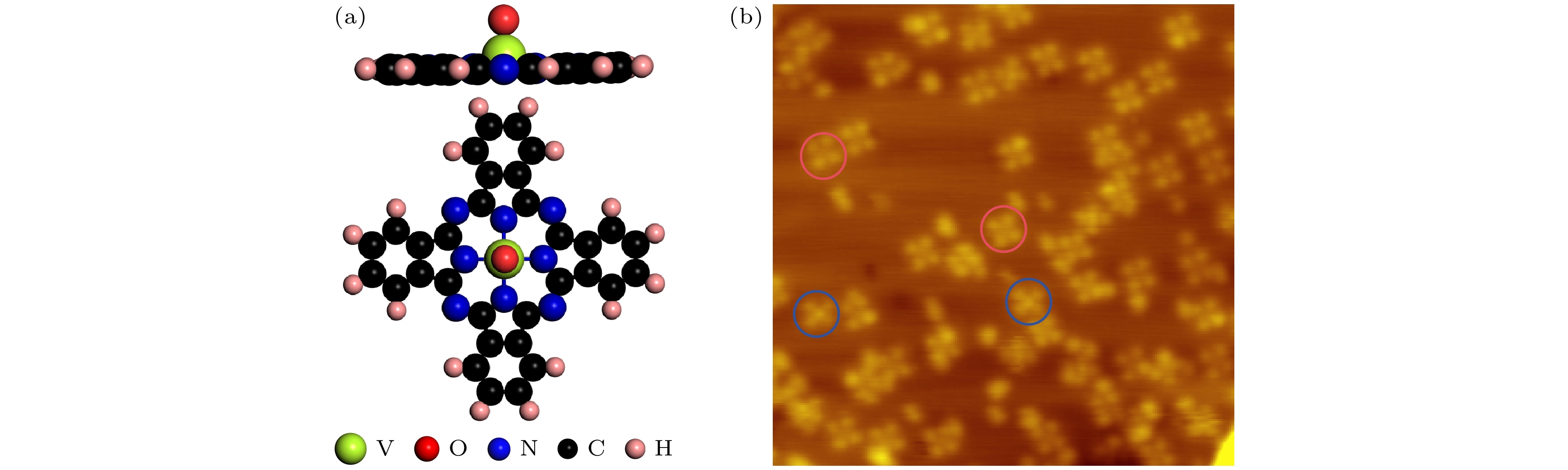 VOPc分子具有四重对称性, 由4个共轭异吲哚亚基和一个中心钒氧离子VO2+组成, 其几何结构模型如图1(a)所示. 与其他非平面酞菁类分子类似, 由于中心VO2+基团突出于酞菁骨架外, 该分子呈现出垂直于π平面的偶极矩2.27D[38]. 当分子平面平行于衬底表面进行吸附时, 在恒流隧穿模式下, STM可将四重对称形状识别为四瓣结构, 而分子中心可成像为凹陷(深色)或突出(明亮)特征, 这通常被认为与氧原子向下(氧原子指向衬底)或氧原子向上(氧原子指向真空)的分子构型相对应. 作为对照, 首先用低温STM研究了Cu(110)表面上VOPc分子的吸附行为. 图1(b)显示了其沉积约0.2 MLE VOPc分子时获得的STM形貌图. 它显示了一种贵金属表面上典型的VOPc分子的吸附情况. 由于热漂移和STM探头的压电蠕变, 分子形状出现某种程度的扭曲. 从图1(b)可知分子吸附在干净的Cu(110)表面, 呈现出平躺的四瓣结构. 初始时因分子与衬底间相互作用较强, 分子吸附主要为随机吸附, 具有多种吸附取向. 可以对比观察到图中存在两种不同的吸附构型, 其分子中心拥有不同表观高度. 图中红色圆圈标记的分子呈现出中心凹陷特征, 而蓝色圆圈标记的分子对应于中心突起特征. 类似于先前对VOPc/Cu(111)[33]和ClAlPc/Cu(111)的研究[39], 我们将具有中心突起的分子指定为氧原子向上的构型, 而具有中心凹陷特征的分子则为氧原子向下的构型. 在STM图中, 分子中心区域的凹陷可归因于氧原子减少了费米能附近的可用态数[35], 中心明亮突起则归因于VOPc分子内氧原子指向真空时其具有相对大的表观高度[38]. 跟之前Ag(111)[33], Ni(111)[35]等表面的研究一样, 在Cu(110)表面上VOPc分子的两种构型共存.