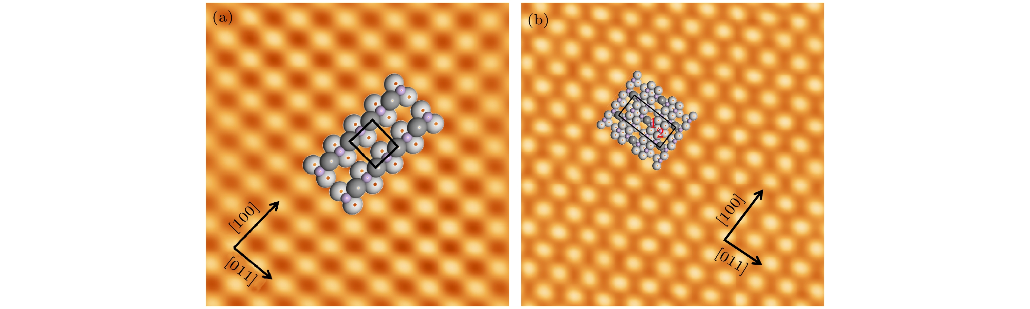 进一步研究了VOPc分子在铜氧化层表面的吸附情况, 通过在高温下暴露氧气来对Cu(110)表面进行氧化. 氧化Cu(110)表面通常会形成两种氧化层结构CuO-(2×1)和Cu5O6-c(6×2)[24]. 图2(a)显示了在约100 Langmuir (1 Langmuir = 10–6 Torr·s)氧气暴露量和约520 K衬底温度下制备的(2×1)结构的原子分辨STM图像. 它显示(2×1)结构具有四重对称性, 其单胞为长方形, 如图中黑色方框所示. 沿[011]和[100]方向, 晶格常数分别为(0.51±0.05) nm和(0.36±0.05) nm. 将(2×1)结构的几何模型叠加在图2(a)上, 可知图中可见的原子对应于表层铜原子, 并且沿[100]方向形成Cu-O-Cu原子链. 氧原子在铜[011]行的短桥位置发生化学吸附, 相邻的Cu-O-Cu链之间存在缺失行. 图2(b)为在约700 K的衬底温度下暴露约3500 Langmuir氧气后形成的Cu5O6-c(6×2)结构的STM形貌图. 该氧化层结构沿[011]和[100]方向分别呈现出(1.53±0.05) nm和(0.72±0.05) nm的重复周期. 其几何结构模型叠加在图2(b)上, 其中两行Cu-O-Cu链沿着[100]方向排列, 并沿[011]方向间隔3个Cu(110)晶格距离, 这样沿[100]方向存在Cu-O-Cu链的缺失行, 顶层铜原子与沿[011]方向成对的Cu-O-Cu链连接. 值得注意的是在c(6×2)结构的每个晶胞中有两种不等价的氧原子, 分别用数字“1”和“2”标记.