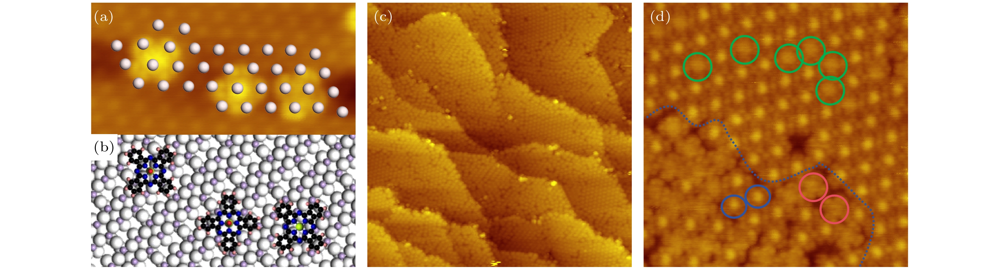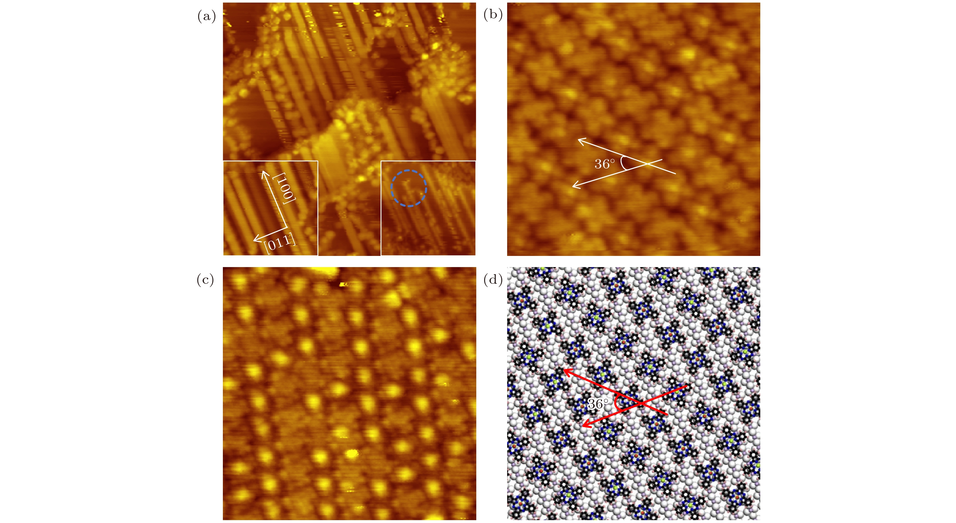 $ {C}_{6} $ 对称性的有序膜, 相邻分子取向的夹角约为36° (10 nm × 10 nm, U = 1.0 V, I = 0.1 nA); (c) 针尖顶端被分子碎片功能化后获得的STM形貌图 (13.7 nm × 13.7 nm, U = 1.0 V, I = 0.1 nA); (d) 对应图(b)的可能组装模型图Figure 3. (a) STM image recorded on the CuO-(2×1) surface with the VOPc coverage of about 0.25 MLE (64 nm × 64 nm, U = 1.0 V, I = 0.1 nA). The right inset shows that VOPc molecules form extended molecular chains instead of molecular diffusion on the terrace (29 nm × 29 nm, U = 2.0 V, I = 0.2 nA). The left inset shows the zoomed STM image which reveals the molecular chains align along the [100] direction (24 nm × 24 nm, U = 1.0 V, I = 0.1 nA). (b) STM topography obtained at the VOPc coverage of about 1.0 MLE. The angle between adjacent molecular orientations is about 36° (10 nm × 10 nm, U = 1.0 V, I = 0.1 nA). (c) STM topography obtained by using a functionalized tip (13.7 nm × 13.7 nm, U = 1.0 V, I = 0.1 nA). (d) The proposed assembly model of panel (b).