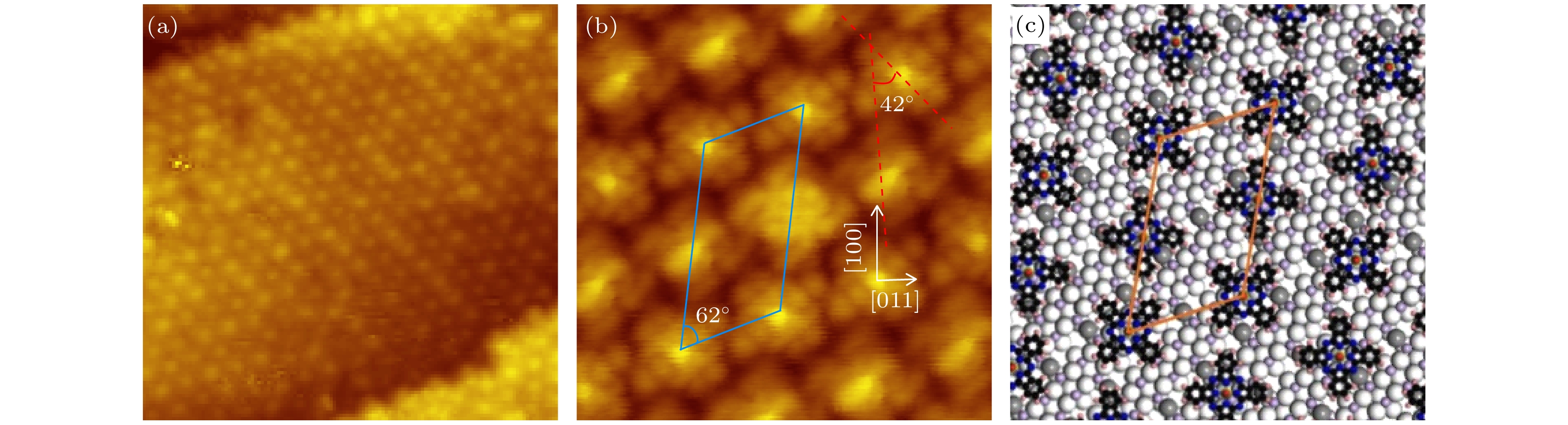 图 5 (a) 0.9 MLE VOPc分子沉积在Cu5O6-c(6×2)表面后获得的STM形貌图 (24 nm × 24 nm, U = 2.5 V, I = 0.2 nA); (b) 当覆盖度约为一个单层时获得的具有亚分子分辨的STM图像 (6.4 nm × 6.4 nm, U = 0.5 V, I = 0.2 nA), 平行四边形单胞用蓝线表示, 相邻两分子取向的夹角约为42°; (c)图(b)对应的分子组装结构模型图, 结构单胞用橙色四边形表示
