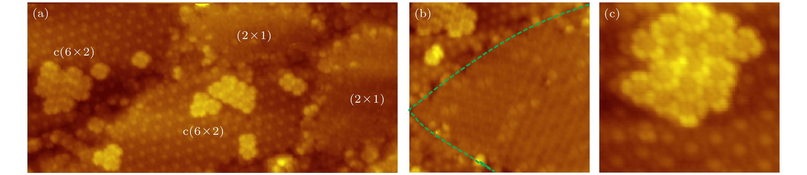 图 6 (a) 在Cu5O6-c(6×2)表面上沉积约0.2 MLE锑原子并吸附约1.1 MLE VOPc分子后获得的STM形貌图 (47 nm × 22 nm, U = 2.0 V, I = 0.2 nA), 图中存在两种不同的组装结构; (b)扫描区域缩小后获得的STM图像 (26 nm × 24 nm, U = 2.0 V, I = 0.2 nA), 两种不同的组装结构用绿色虚线分隔; (c) 在Cu5O6区域缩小扫描范围后获得的STM 形貌图 (15.6 nm × 15.6 nm, U = 2.0 V, I = 0.2 nA)