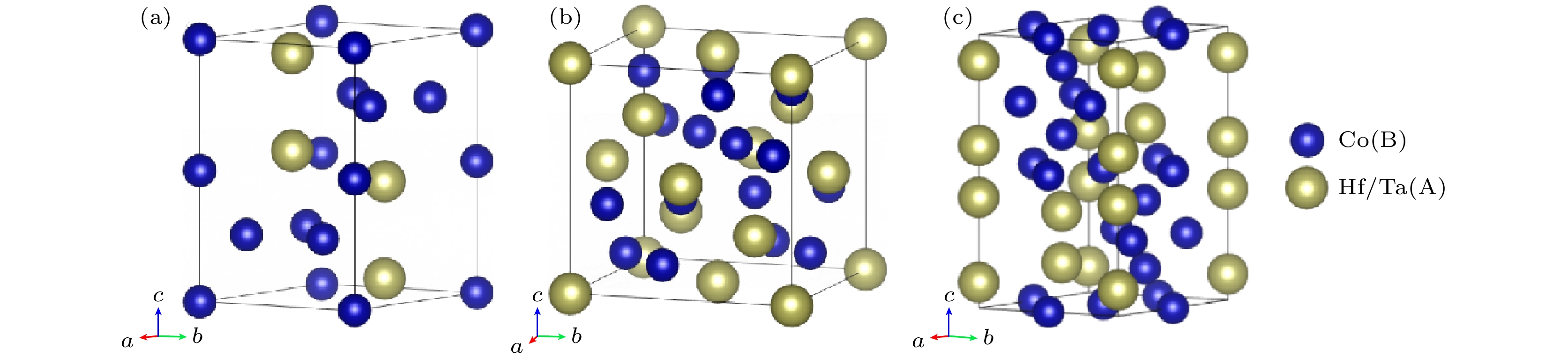 • Laves相分为3种结构类型, 分别是C14 (P63/mmc), C15 ($Fd \bar{3}m $), C36 (P63/mmc). 这3种结构类型如图1所示, 晶体信息汇总见表1. 根据这些结构信息, 构建了本文中Laves相Co2Hf和Co2Ta的初始晶胞模型, 根据合金的原子半径或实验参数, 对晶格参数进行评估.