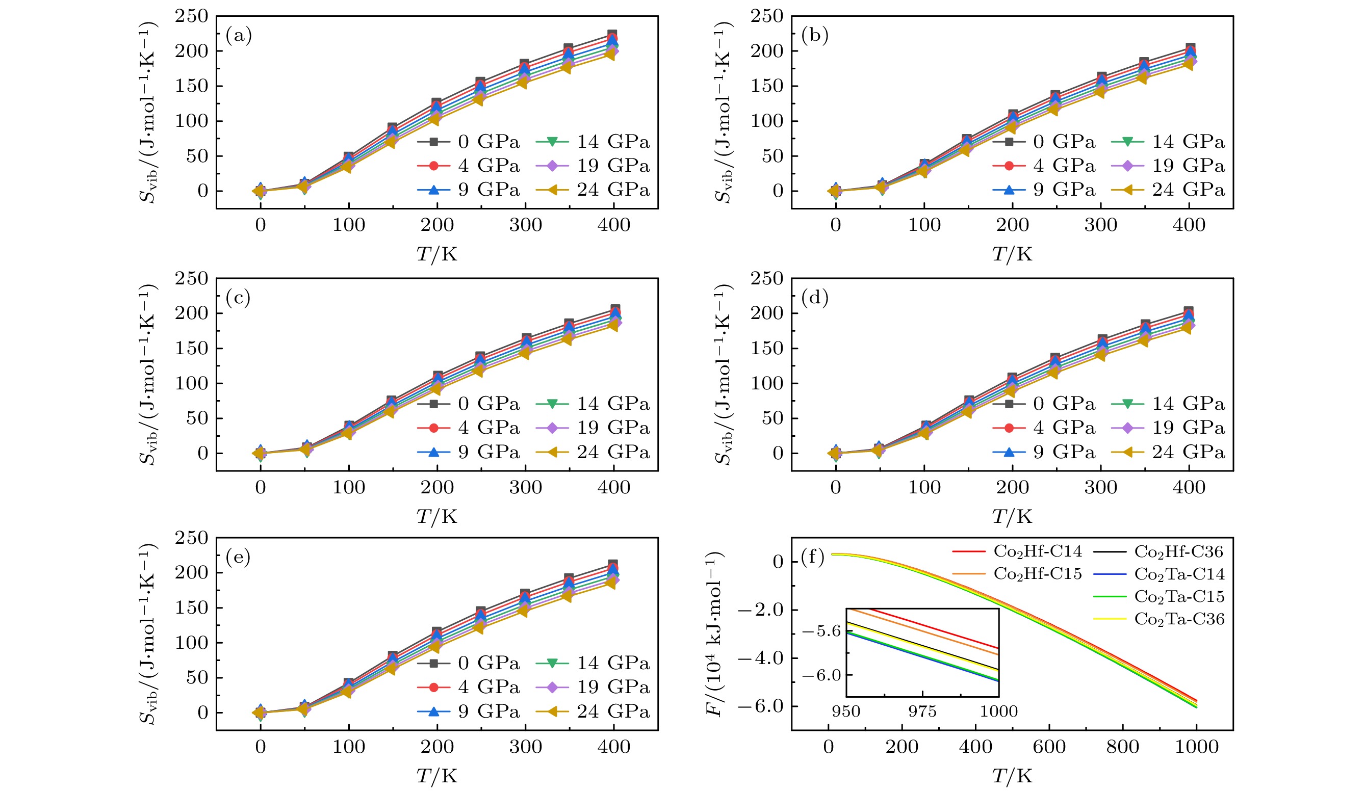 Figure 10.  Vibrational entropy versus temperature under different pressures: (a) C15 Co2Hf; (b) C36 Co2Ta; (c)–(e) C36 Co2Hf0.25Ta0.75, Co2Hf0.5Ta0.5, Co2Hf0.75Ta0.25. (f) The free energy versus temperature for Co2Hf and Co2Ta.