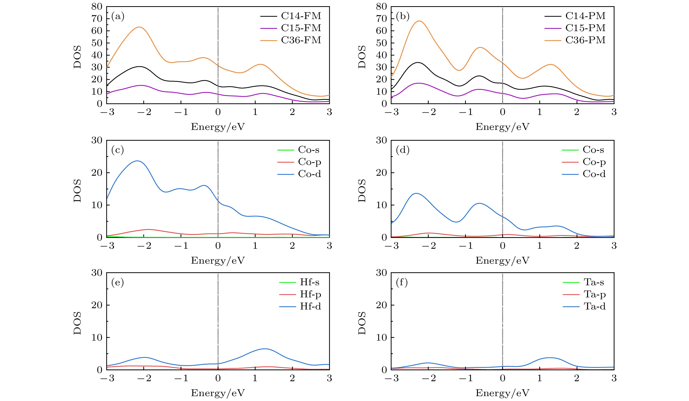 图 11  Co2Hf和Co2Ta总态密度和分态密度(垂直虚线表示费米能级) (a), (b) C14, C15, C36相的Co2Hf和 Co2Ta的总电子态密度; (c), (e) C14相 Co2Hf的分态密度; (d), (f) C36相Co2Ta的分态密度