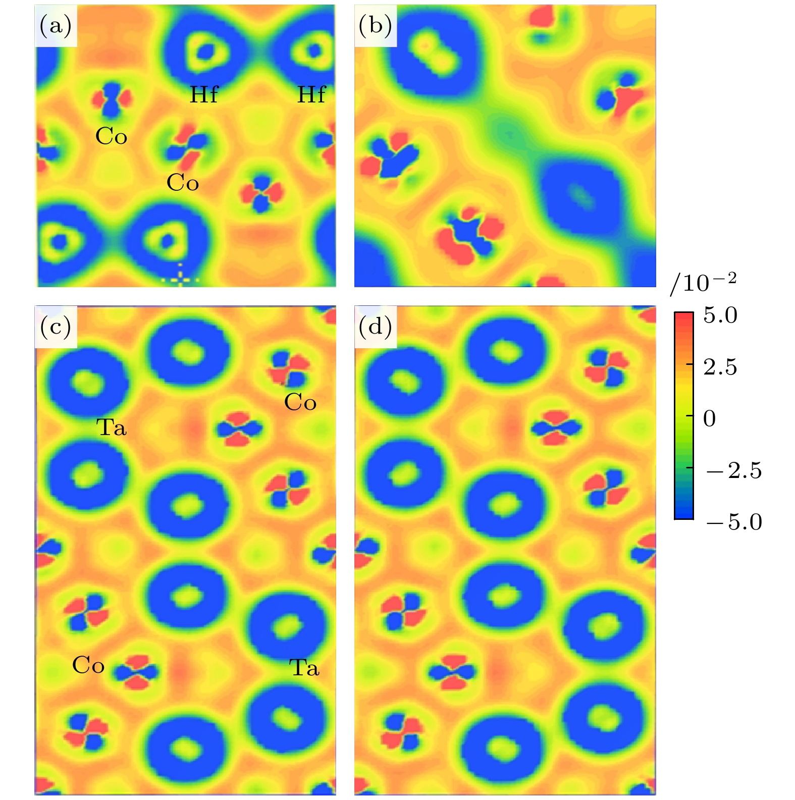 差分电荷密度图可以用来直观地展示晶体结构中原子之间的电荷转移以及在晶格间电荷重新分布. 从图12可以看出Co原子周围电荷密度的局域程度比Hf/Ta原子要强, 且展示了d电子的电子云分布的特征, Co与Hf和Co的成键有一定的方向性, 呈现了共价键的特征.