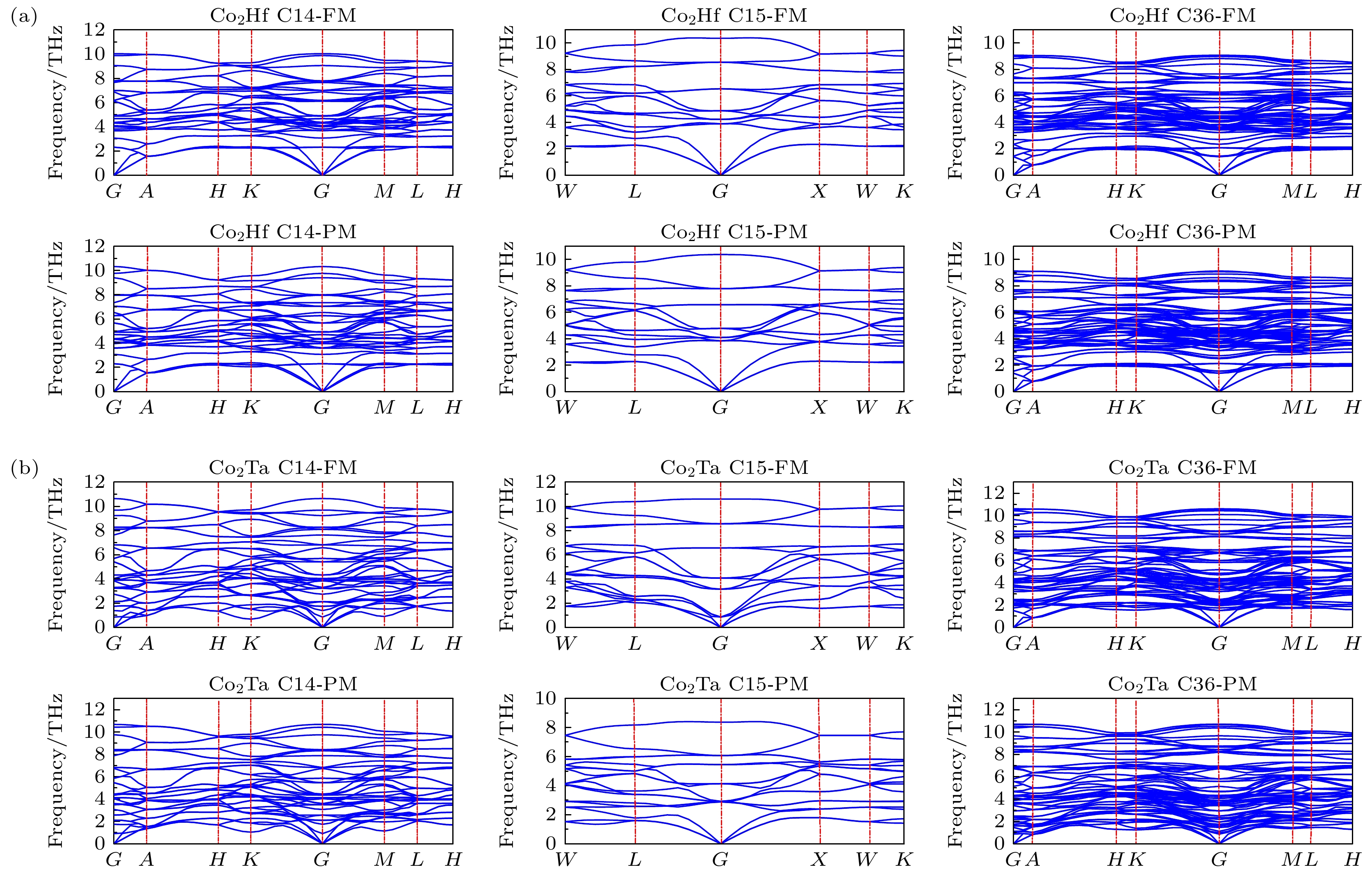 为了进一步从晶格动力学方面研究Co2Hf和Co2Ta的稳定性, 图2描述了两种磁态下3种结构沿布里渊区高对称点的声子色散关系. 对于C14, C15和C36结构, 原胞中原子数(N )分别为12, 6和24. 因此, 在由3个声学声子模和3N – 3个光学模组成的声子谱中应该有3N个声子模. 根据声子模与原子数的关系(3N ), 原子数较多的C36结构有较多的声子模 [36]. 在稳定的结构中, 声子无虚频. 虚频的存在通常表示结构中存在不稳定的振动模式, 通常代表结构的失稳性. 在图中曲线呈现类似频带的形状, 在所有高对称点上得到频率全为正的谱线, 没有发现负频, 表明Co2Hf, Co2Ta的C14, C15, C36相在不同磁态下结构均是动力学稳定的.