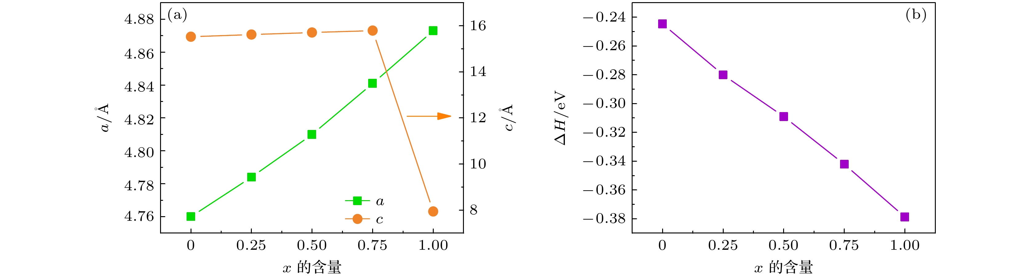 图 3  Co2(HfxTa1–x)合金的晶格参数(a)和形成能(b)随Hf含量x的变化